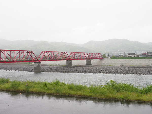 川沿いの側道に出ると踏切の警報音が鳴り、ちょうど目の前でバーが下がった。赤く大きな単線の鉄橋を、一両編成の車両が向かってくる。このタイミングを待っていたのだろうか、踏切の脇でカメラを構える人がいる。私も窓を開け、川を渡る風の匂いを嗅ぎながらシャッターを切った。幸先の良いスタートだ。