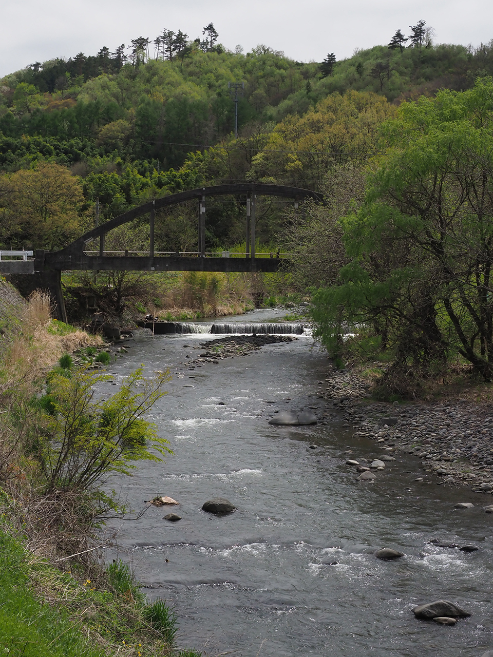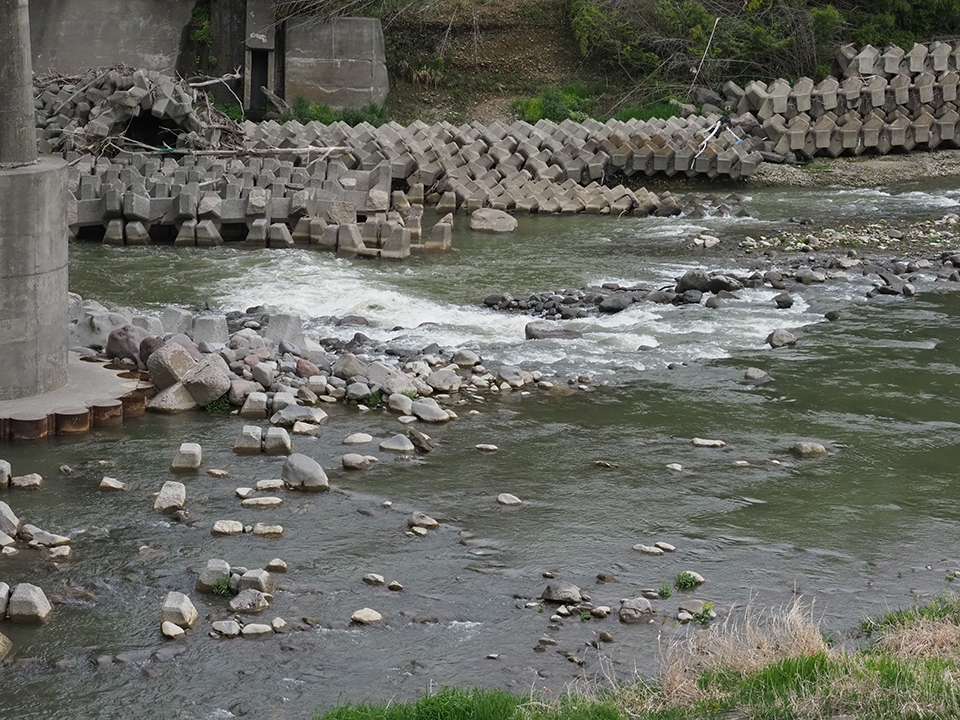 思われている以上に川の魚は上・下流に移動しているものだ。イワナは秋になると産卵のために細い支流に入るし、アユは川を下りながら産卵に適した砂礫の瀬を探す。一方ウグイは春から初夏にかけて産卵のために川を上る。上りながら産卵に適した水通しの良い砂礫底を探す。川を上ってくる魚にとって堰は大きな障壁だろう。魚道が備わっていたとしても、堰の下は一時、魚が溜まる場所となるはずだ。ならば、このあたりでウグイの気配を感じることはできないか? そう思って川をのぞいてみた。