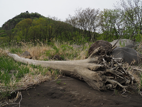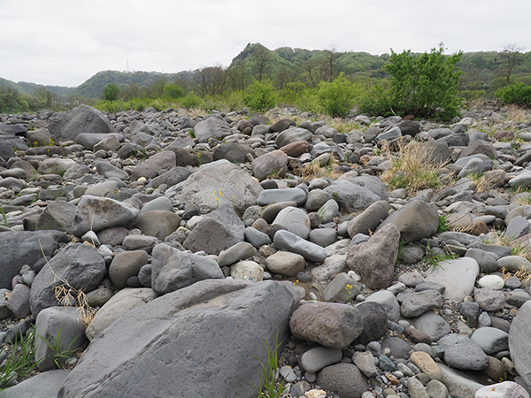 下流に向かって川原を歩く。大きな石に混じってこぶし大の丸い石がゴロゴロと積み重なっている。まるでビリヤードの球のような丸さは、千曲川の強い流れに削られたためだろう。少し行くと、大きな石が山のように積み上げられた跡が5つか6つ、川原に点在していた。明らかに人の手によるものだが、不思議と風景に馴染んでいるようにも見えた。のちに調べてみると、どうやらウナギなどを獲る「ゴロ漁」の跡らしい。