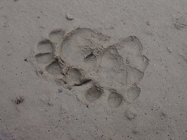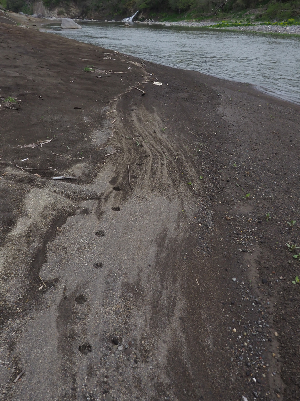 広い河道には所々に若い木々が生えていた。その向こうには広大な砂礫の川原が続いている。木々の下には草をかき分けるようなケモノ道があり、その傍らに何者かのフンが落ちていた。鼻にツンとくる独特の匂いはおそらくキツネのものだろう。河道には朽ちた木が横たわり、その近くにはオニグルミの若い木がヒョロヒョロと伸びていた。あらゆる川辺で見かけるサイカチの巨木もある。自然豊かな一角の雰囲気を楽しみながら水辺に出ると、ぬかるみにケモノの足跡を見つけた。ひとつはタヌキ。あとはハクビシン? キツネらしき足跡もある。背後の木々からウグイスとキジの声が聞こえる。さほど動いてもいないのに、警戒心の強いアオサギが私の姿を遠目に認めて飛び立っていった。