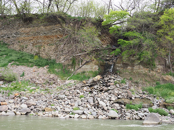 いつしか雲は散って消え、西に傾いた日射しが空気を琥珀色に染めた。丸い石の川原を下流に歩くと、対岸にそびえる高い崖に西日が当たり、地層が浮きだした。長い年月をかけて流れに削り取られたものだろう。漠とした河原には、かまくらのようなゴロ漁のシルエットが転々と浮かんでいる。河道に並ぶヤナギの間に太陽が落ちると、途端に冷えてきた。早々に釣りを諦め、強い風を受けながら誰もいない川原を歩いた。