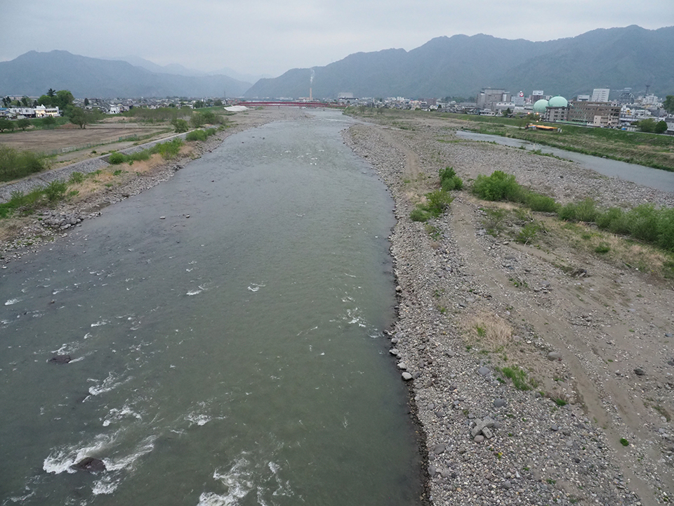 翌朝、ウグイのつけば漁を見せてもらう前に、千曲川に架かる常田新橋に備えられた展望塔に登り、川を見下ろした。川の中央には大きな中州が広がっている。今回、見学をお願いした「鯉西」の漁場が中州の下流端に見える。その向こうには、赤い千曲川橋梁。広い千曲川を見渡しながら、台風時の増水を想う。自然は大きい。中州につかまっているように見えるつけばが心もとなく思えた。