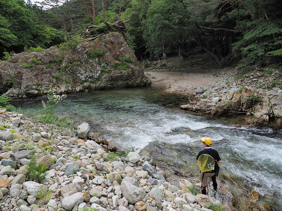 日光江戸村や東武ワールドスクエアなど、温泉とセットで楽しめる全国的にも有名な行楽地を横目に、鬼怒川に沿って国道121号線を北上する。鬼怒川温泉の北端、川治温泉街の入口を通りすぎ、鬼怒川本流と分岐すると、風光明媚な五十里湖が眼前に現れる。細長く穏やかな湖の風景は少しずつ山あいを狭め、いつしか湖は流れの際立つ川となる。ウインドーを開けると、ひんやりとした空気とともに、眼下には玉石を洗う清らかな流れが光った。関東屈指の清流、男鹿川である。