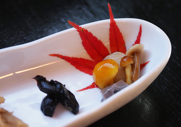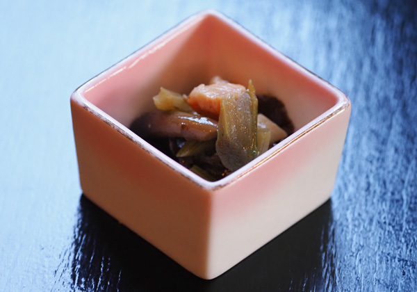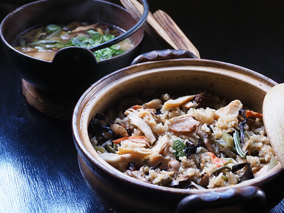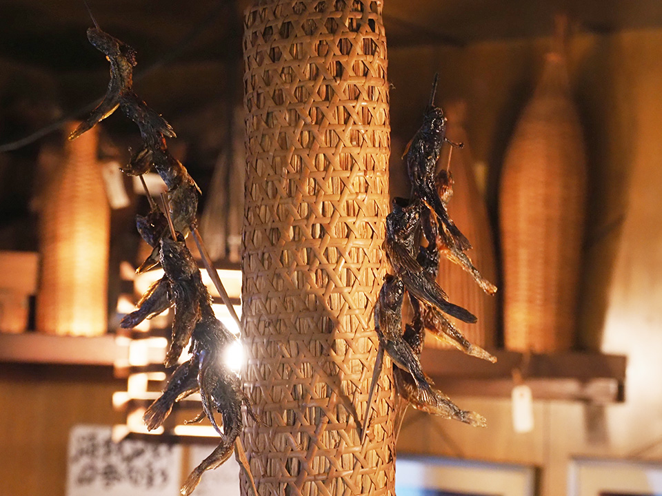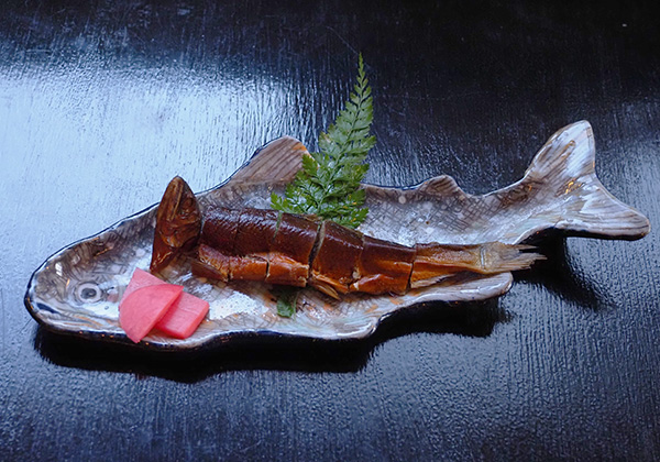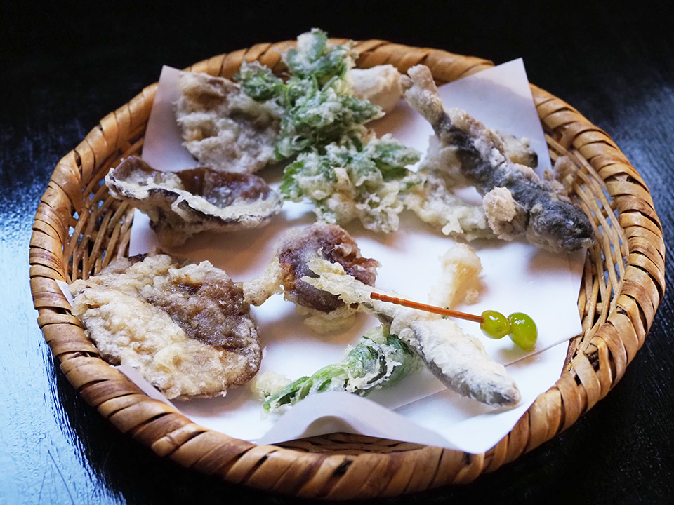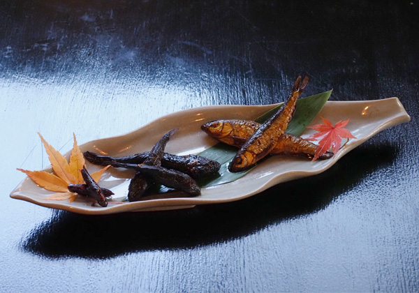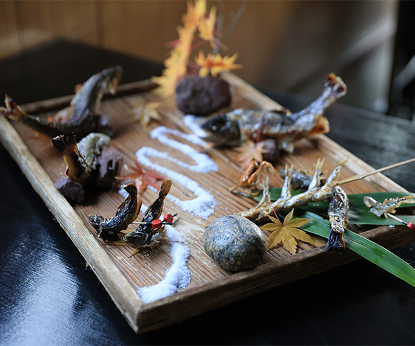 川魚が焼き上がり、料理が並べられた。新潟県の清津川で秀雄さんが釣った、背の張った見事なアユの塩焼きを中心に、イワナとヤマメ、そして今朝獲ったカジカとギンタが香ばしく焼き上げられている。塩で描かれた川の流れを、躍動感あふれる渓魚が生き生きと泳ぐ。見事な逸品。冬に美味しいオイカワとウグイはお酒と醤油で香ばしく焼き焦がした雑魚串に、この季節の主役であるキノコは天ぷらにお鍋、さらには山菜と合わせた炊き込みご飯に前菜の「含め煮」と、この季節の山の幸、川の幸が、ともんならではの味覚として並べられていく。山桜の燻煙をまとったアユの燻製に、オイカワとカジカの甘露煮、イナゴの佃煮。ともんで初めて知る味ばかり、というお客さんも多いことだろう。