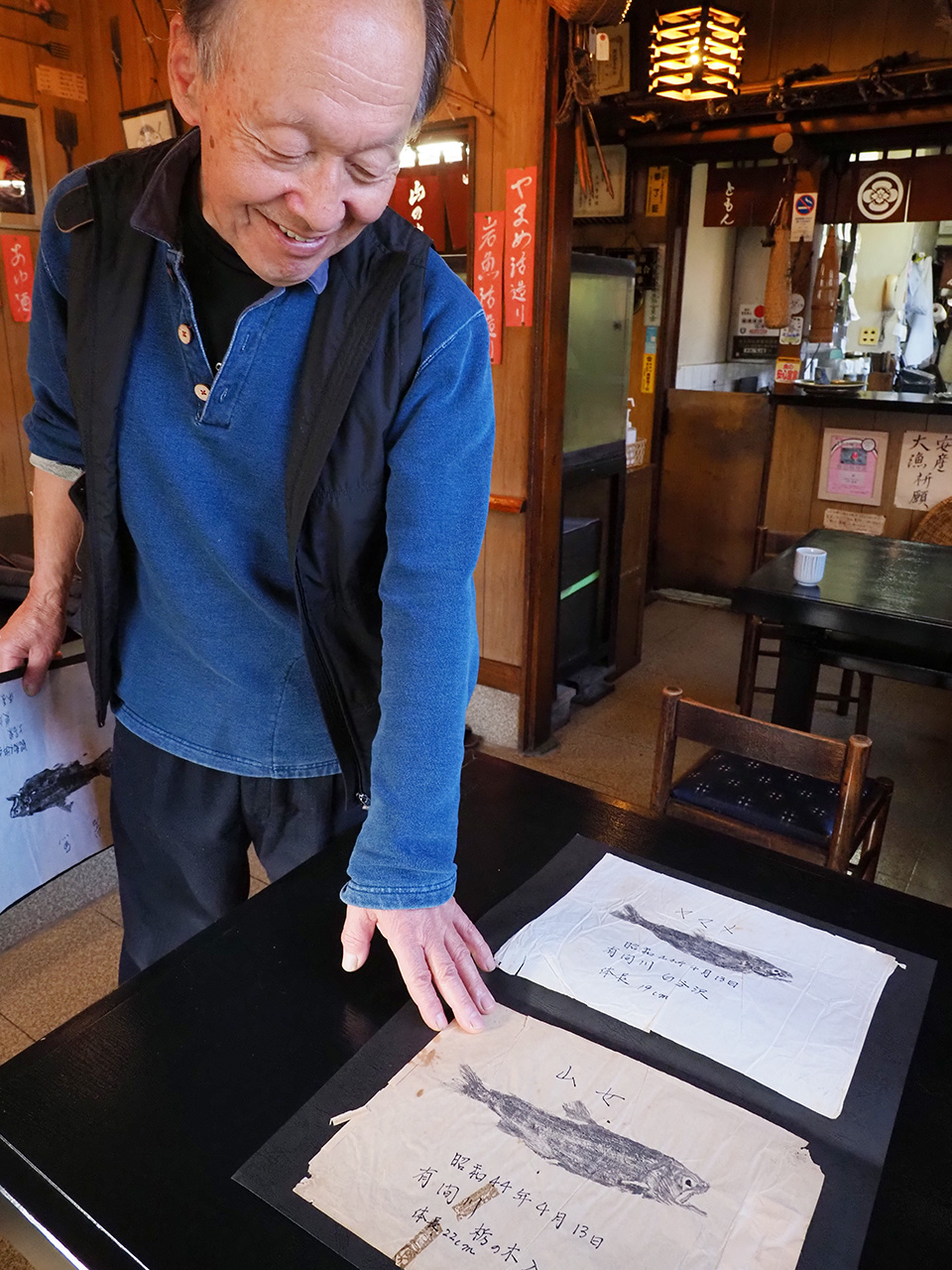 貴重な魚拓を見せてもらうと、なんとその翌年に釣ったという生涯初のイワナの魚拓もあった。当時の秀雄青年の渓流釣りに対する半端ない熱量が、決して大きくはない魚たちの魚拓からひしひしと伝わってきた。夢中になって渓流魚を追いかけ、気づくと各地で魚を獲って暮らす人々との付き合いが深まっていたという。
