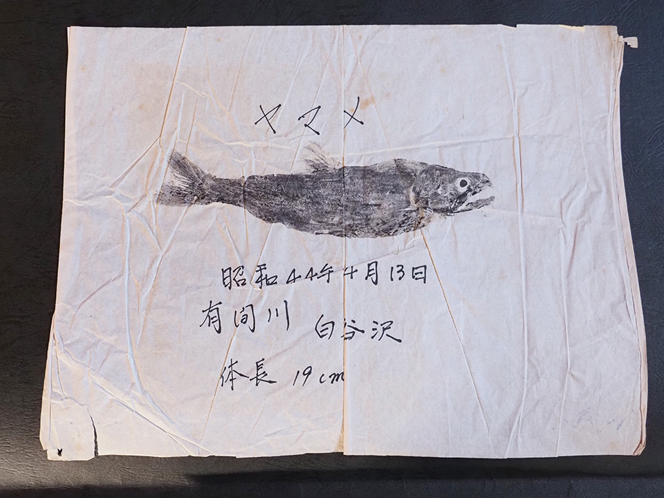 「元々渓流釣りは、山が好きでイワナを知ったタイプではなく、入間川の魚獲りが大好きで、上流に上っていったタイプなのね。その有間川でも相当の大物に出会っているわけなんだけども、なんと生涯で最初に釣った19cmのヤマメの魚拓を持っているの。普通は大きい魚が釣れて初めて魚拓ってとるじゃない。でも僕は最初のヤマメに超感動しましてね。昔のわらばん紙に見よう見まねでとったんです。初めてのホームランの球を持っているようなものですよね」