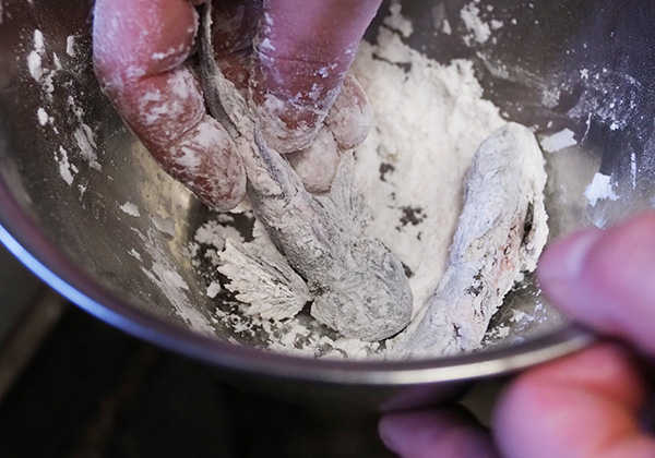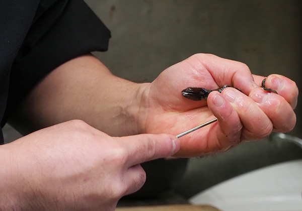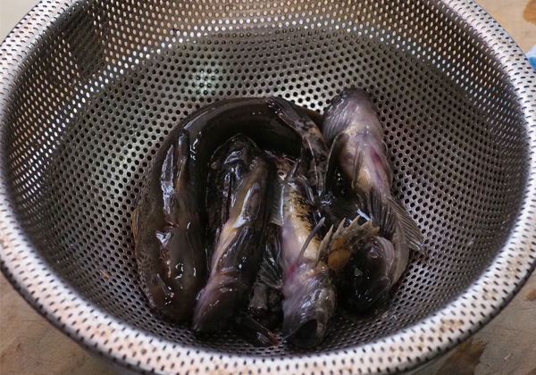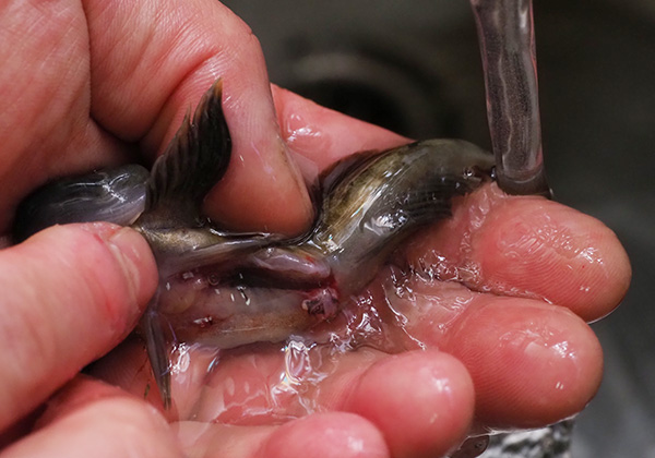 調理場に入れてもらう。塩焼き用に並べられたイワナ、アマゴ、アユの隣に目を移すと、ステンレス製のザルに今朝突いたカジカがひと盛り移されていた。川底でじっとしている姿とはまた異なる食材としての美しさがあった。剛さんは軽く水洗いしてぬめりを落とすと小出刃で腹を割き、中のわたをぎゅっと押し出した。