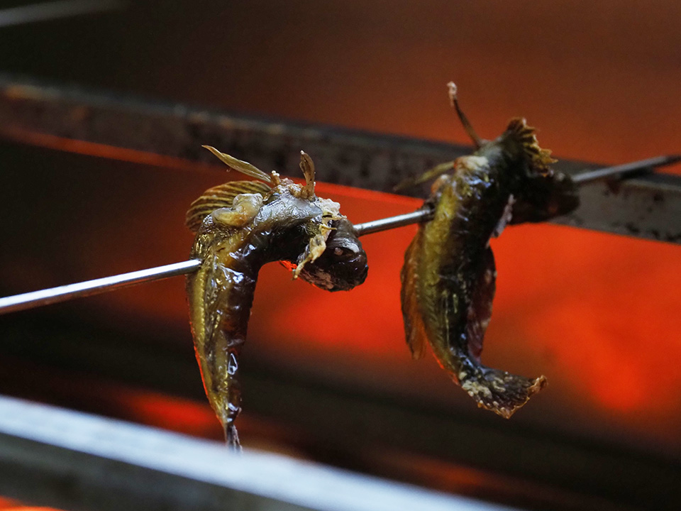 手早く2匹を一本の串に打つ。喉元に刺して、胸あたりで抜くと、カジカはまるで生きているかのように身を反らせた。大きな胸ビレに塩を当てて火にかける。鮮度の良いカジカは熱を加えると胸ビレが勝手に広がっていくという。ギンタ(ギバチ)も同様に串を打って火にかける。