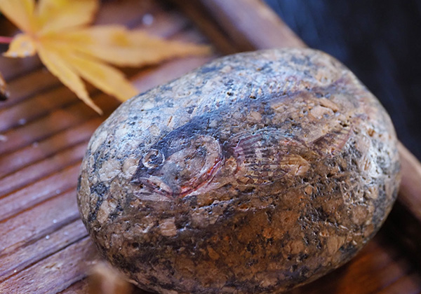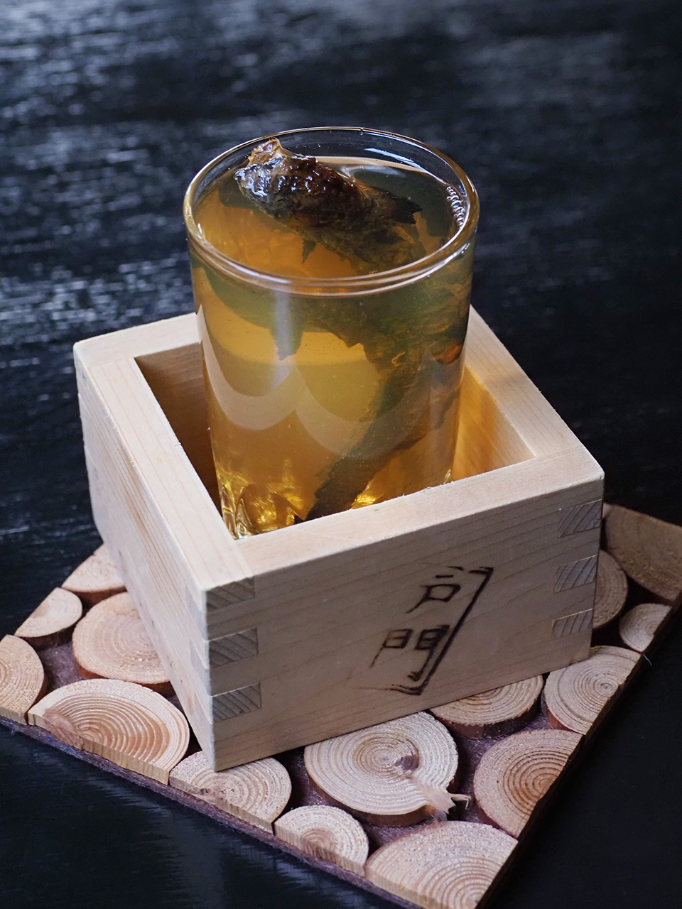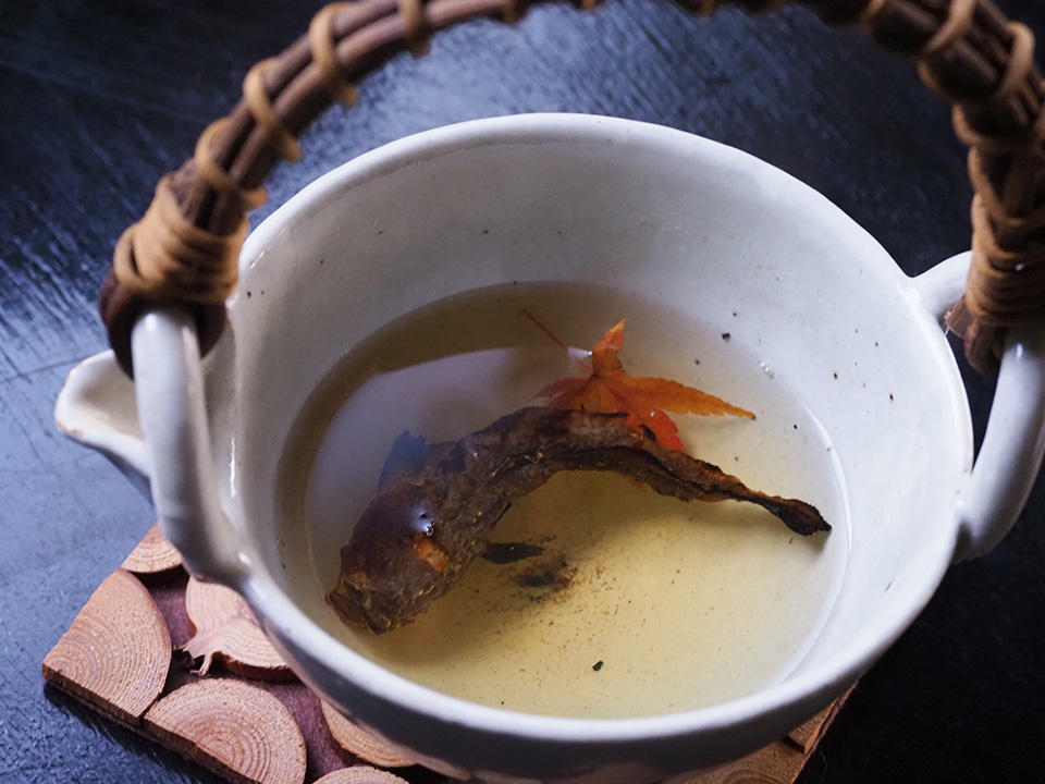 そして、お待ちかねのカジカ酒だ。皿状の急須に焼き枯らした一匹のカジカを寝かせ、熱燗を注ぎ、もみじの葉を一枚飾る。イワナの骨酒は好きでよく飲んでいるのだが、カジカ酒は初めてだった。注いだグラスを口に運んで傾ける。フワッと燻されたカジカの風味が鼻を抜けて、旨味の滲み出した温かい酒が喉に流れ込んできた。美味い。魚が小さいからそう感じるのかもしれないが、イワナ以上に深みのある繊細な味に思えた。2杯目からは小さなコップにカジカをさして、熱燗を注ぐ。しばらくすると、出汁で酒が琥珀色に染まっていった。より濃厚な味が喉を通って腑に収まる。3杯目、4杯目と楽しんだ。たった一匹の小さなカジカが、これほどまでに酒を美味しく、楽しくさせてくれるとは。コップの中のカジカを見ると、「いただきます」という感謝の気持ちが自然に湧いた。