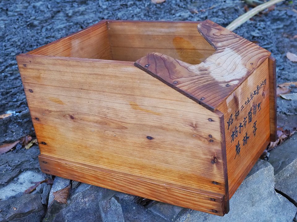 秀雄さんの話を聞きながら、カジカ酒を楽しんでいると、ふと剛さんが、私が持参した箱ガラスの使い方を秀雄さんに聞いてくれた。今は亡き父の実家を取り壊す前に蔵の中に眠っていた20×30cmほどのガラス面を持つ箱ガラスを持ち込んでいたのだ。内部の端には布を巻いた一本の角棒が渡してあり、位置がやや不自然だと思いながらも取っ手だろうと考えていた。表面には父の名前と「昭和二十五年七月二十七日」という日付が墨で書かれている。父は昭和12年生まれだから13歳の時に贈られたものなのだろう。秀雄さんに見せると、おもむろに箱ガラスを顔に被せるようにして見せた。