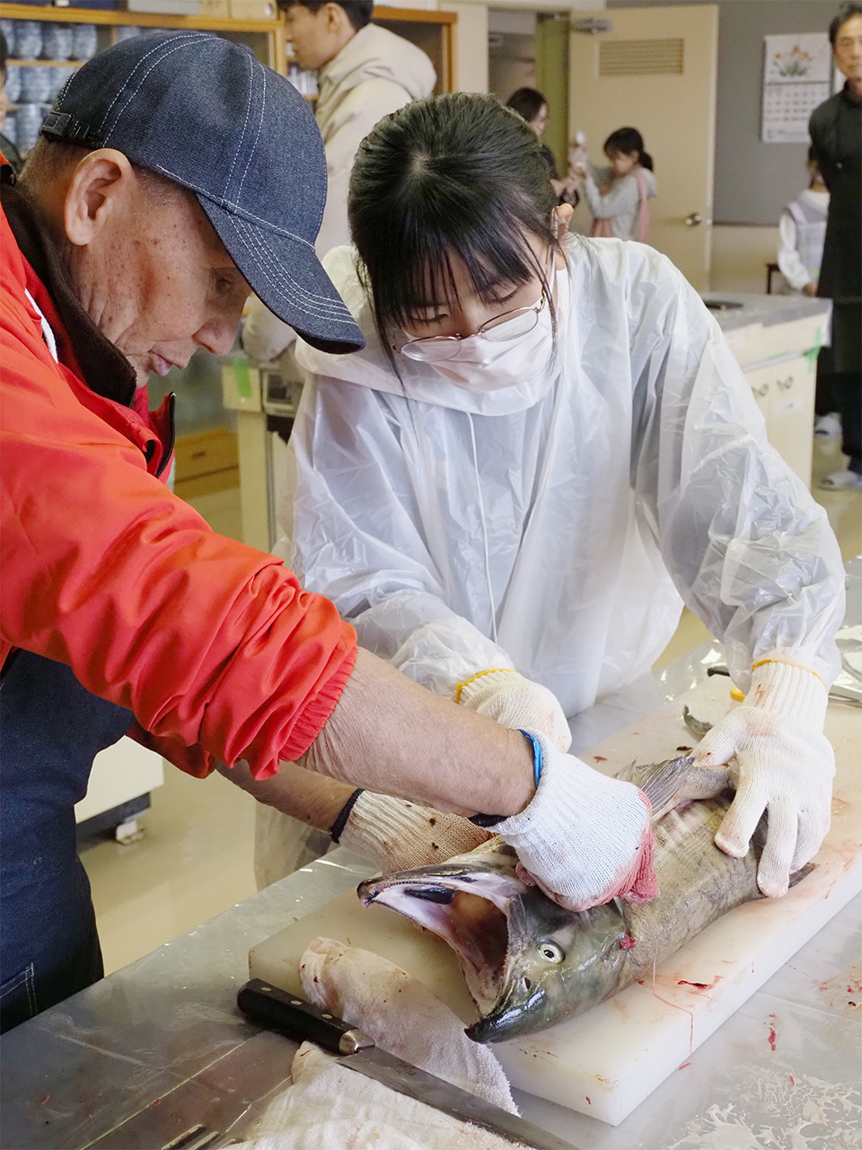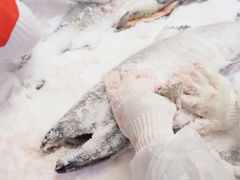 シュッ、シュッ、シュッ……。大型のサケの身に粗塩を擦り込む心地よい音が室内に響く。大きな軍手をはめた小さな手が、サケを慈しむように前後する。無心に塩を引く小学校中学年の女の子の隣では先生役のおじいさんがサポートするようにサケに手を添える。尻尾から逆撫ですることで倒れた一枚一枚の鱗を起こし、そこに塩を行き渡らせていく。エラやヒレの付け根、目玉にも丁寧に塩をまぶしていく。ジンギリづくりで最も重要な作業の一つは、サケを見て、サケを手で撫でる作業なのだ。