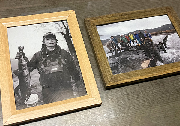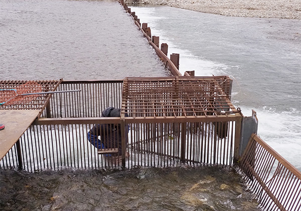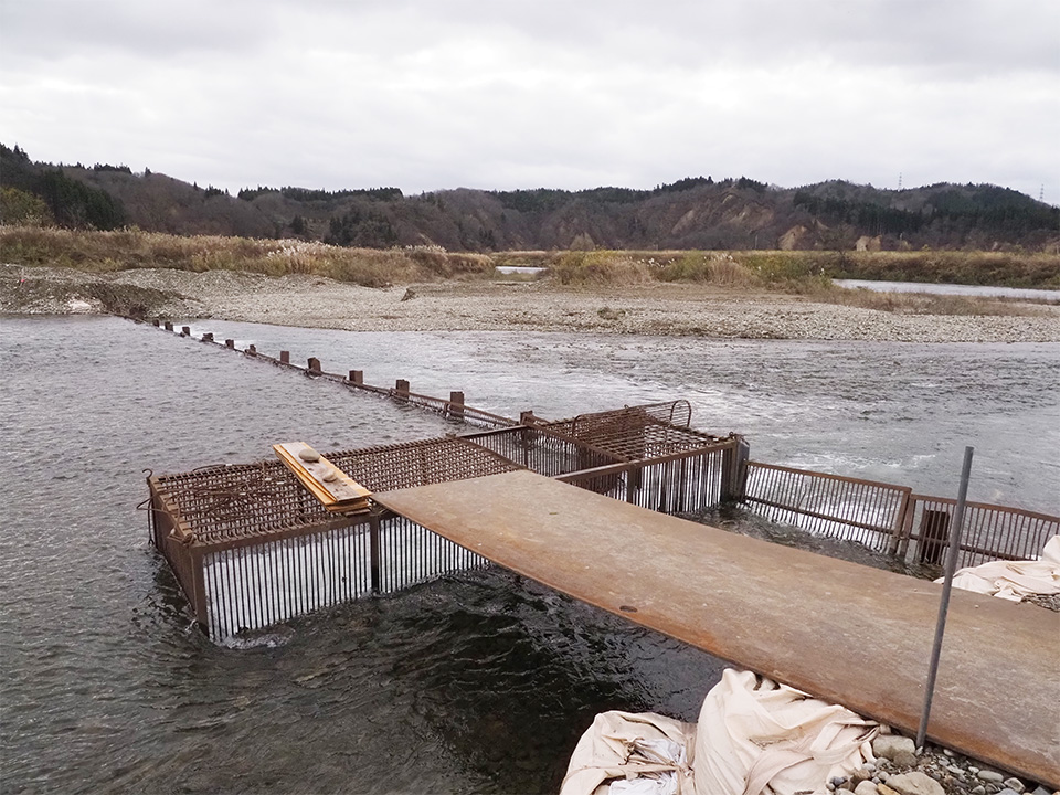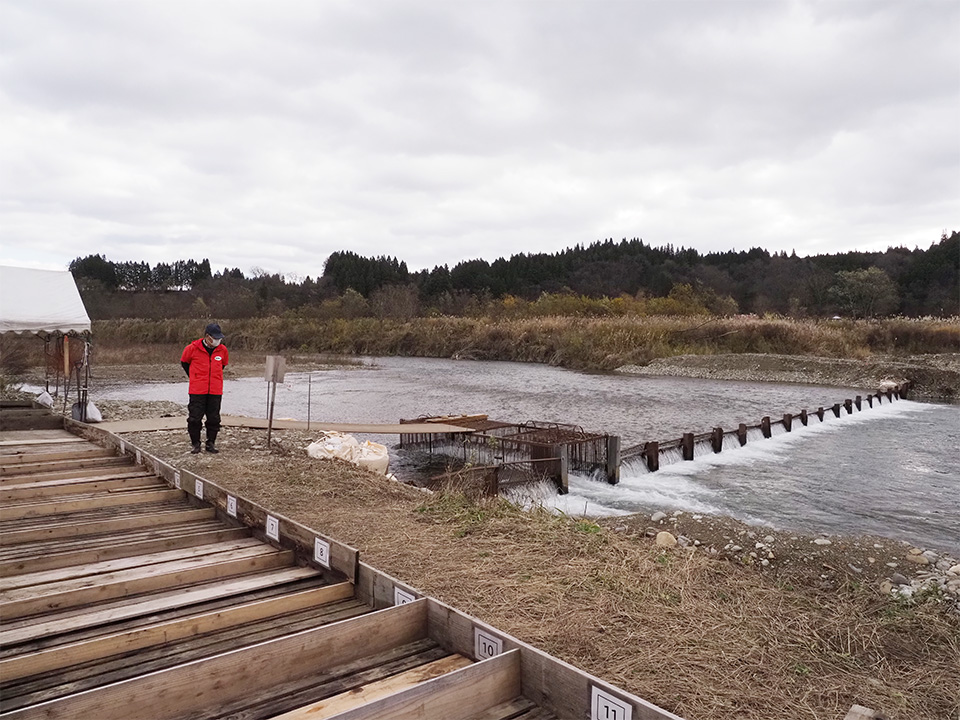 「この先を越えてあっち側へ行くことはできないので、必ずあそこを通って上に行こうとします。見えますか、あの三角になった入口に入ると出られない仕掛けになっています。サケが多かった時代には、一人で200から300ぐらい捕まえてました。そこの仕切りのある箱に、隙間なくぎっしり収まるぐらいサケが獲れていたんです」