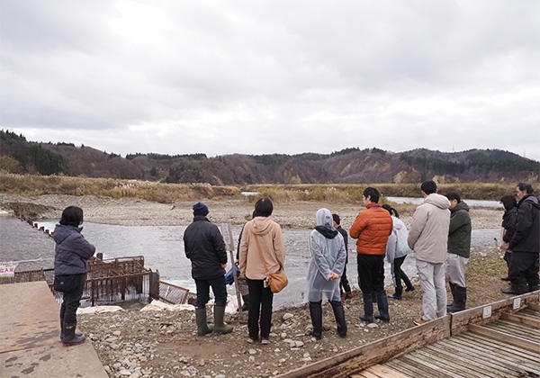 鮭の新切り教室では、作業の前段として、鮭川に設置されたウライと人工孵化放流を行う漁協の孵化場を見学する時間を設けている。鮭川村のウライは鮭川本流ではなく、支流の泉田川下流部に作られている。かつては本流に設置した時代もあったが、上流の真室町までサケが上がらないことが問題となり、支流に設置されるようになったという。