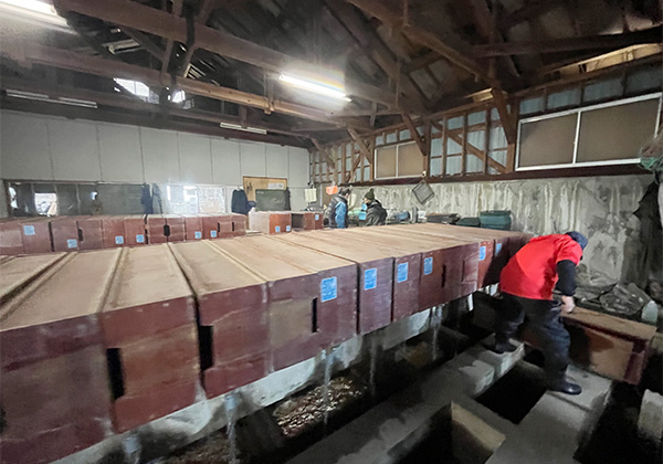腹を割き、内臓やエラを取り出し、背骨に付いた血合をスプーンでこそげとり、よく洗ってぬめりと血を落とす。それを、塩を山盛りにした台に乗せ、全体に塩を擦り込んでいく。最後に腹にたっぷりと塩を詰め、それがこぼれないように抱えて運び、用意されたプラスチック製のコンテナに重ねていく。次は約3週間後。それまで冷暗所で塩に浸ける。身に塩を効かせ、余分な水分とともに臭みを抜く。