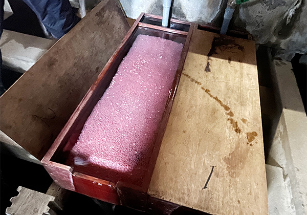 ウライを前に、サーモンロードの会の矢口春巳会長が説明する。傍には大きな木製の箱がある。畳を縦に2つ並べたぐらいの大きさで、木板で仕切られている。ウライで採ったサケは卵と精子を採った後、均等に枠に分けられて、参加した仲間でくじを引いて分配する。数年前まで1シーズンで3000匹ほど採れていたサケが、今年はその10分の1ほどしか採れていないという。説明の後、矢口さんは胴長(胴付長靴)を履いて捕獲柵の中に入り、サケを探してくれたが1匹もいなかった。実は鮭の新切り教室用のサケも直前まで揃えられるかわからず、他所からの購入も考えたという。なんとか前日までに集めた10匹を、このために用意することができたと話してくれた。