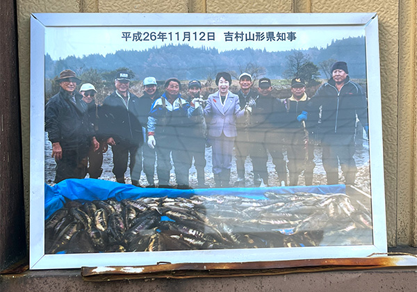 教室を終えた後、矢口さんの自宅にある寄合部屋で、鮭川のサケとサーモンロードの会について話を聞いた。サーモンロードの会は矢口さんのお父さんである矢口秀資さん(2023年に逝去)ら4人の有志が1999年(平成11年)に立ち上げた会だ。発足の理由は村名でもあるサケの有効利用と食文化の後世への継承。かつてこの地で作られていた「ヨーのジンギリ」を復元し、村の中心を通る国道458号線の軒並みに吊るして「鮭の道」を作ろうと始められた。
