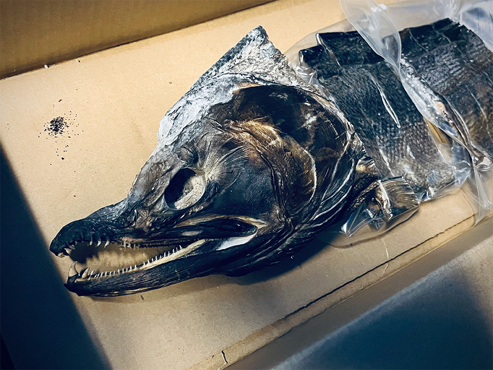 話を終えての帰り際、冷凍庫に入れてあった前年のジンギリを見せてくれた。驚くとともに事前の不勉強を恥じた。そこには村上などで作られる塩引きとはまるで別物の、黒ずんで硬く乾いた1本のサケがいた。
