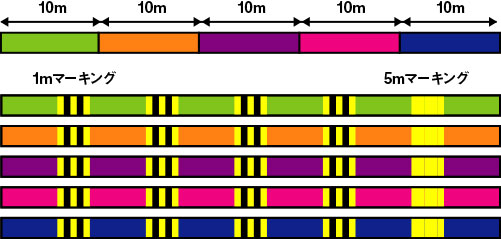 10m×5色(ライムグリーン/オレンジ/パープル/ピンク/ソルティガブルー)、1mマーキング「黄・黒・黄・黒・黄」、5mマーキング:黄(ロング)