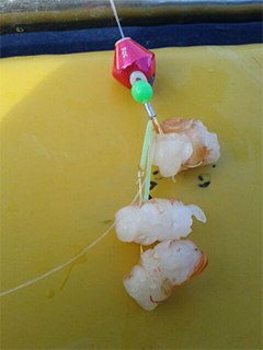 東京湾では冷凍のアルゼンチンアカエビやアマエビを使って軽い10号錘のカットウ仕掛けで小さなアタリをとって合わせる釣り方をしています。底がとれ、オマツリがしなければ6号、8号とより軽い錘でより繊細な釣りも可能。