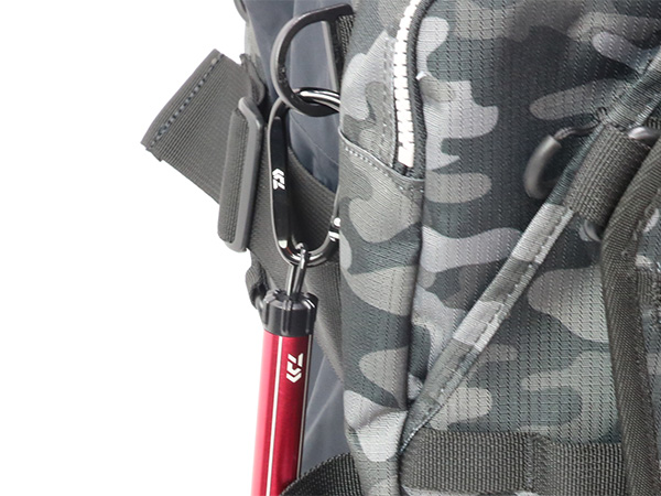 カラビナ標準装備でゲームベストやバッグのDカンなどに簡単に取り付けが可能。