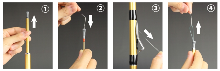 4.トップからワイヤーを引き出せば、道糸が通せてセット完了。