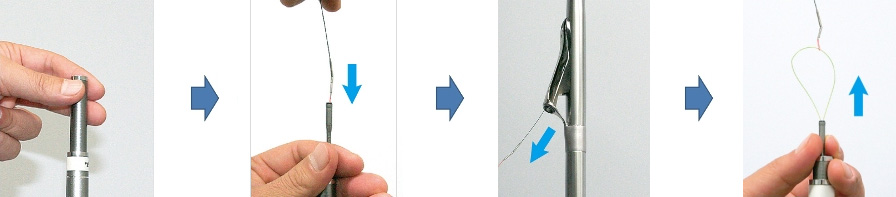 リールをセットし、元上をしっかり伸ばしてトップからワイヤーを通し、エントランスガイドから出てきたワイヤーに糸を通して、トップからワイヤーを抜く糸通しシステム。糸通しの便利さだけでなく、コンパクトに仕舞えて理想の調子を実現できるダイワのテクノロジーのひとつ。