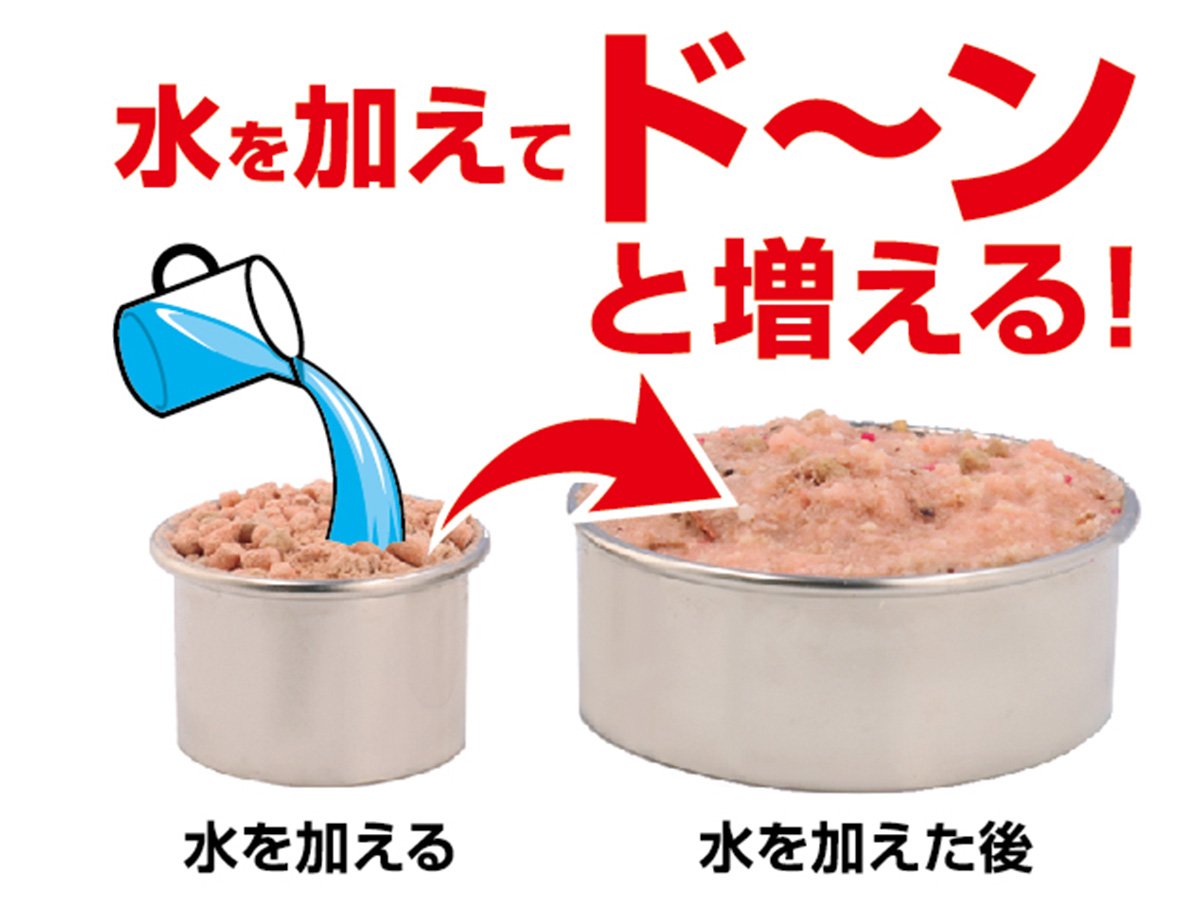 増える素材配合。乾燥した圧縮ペレットが水を吸収し大きくボリュームアップ!