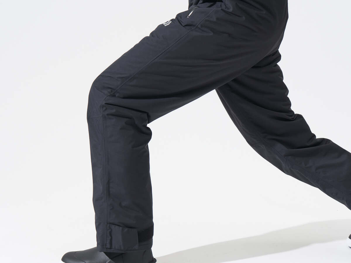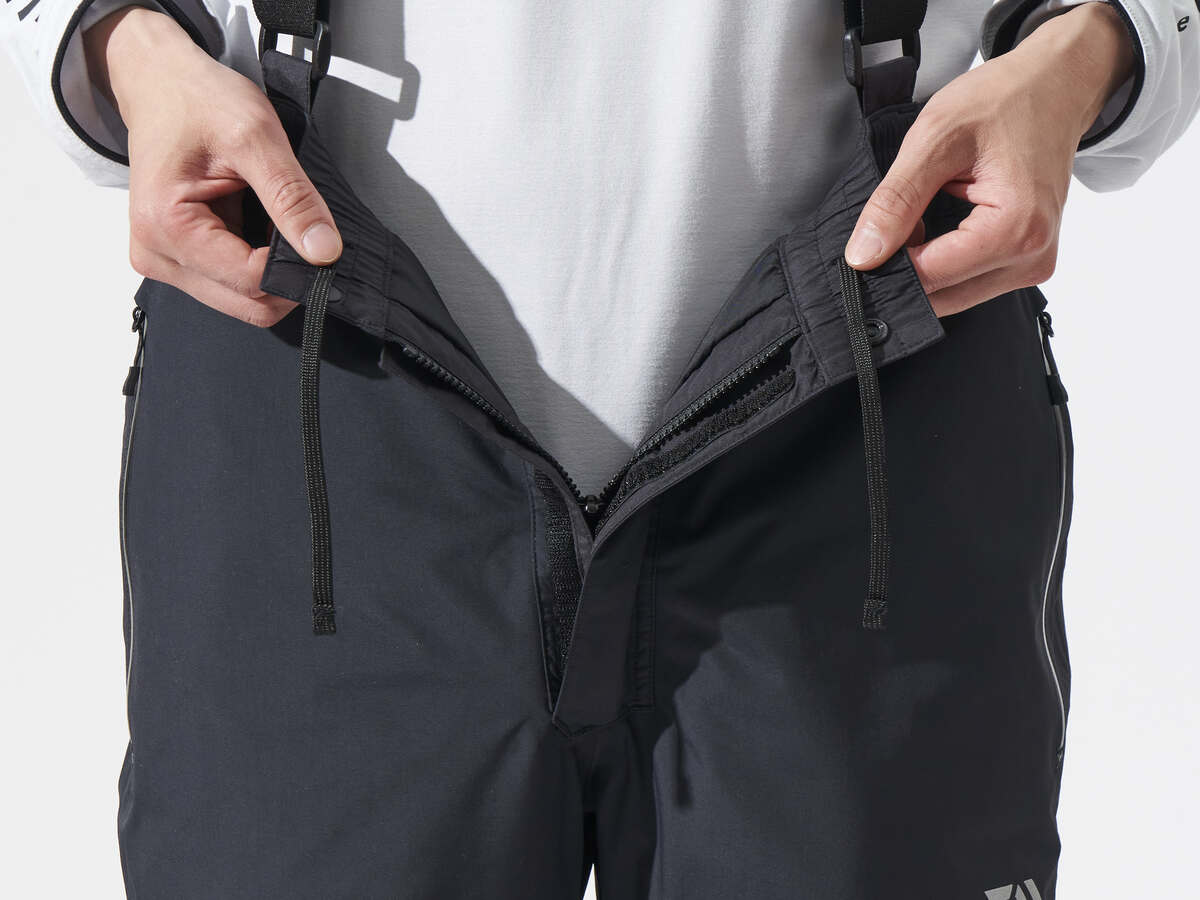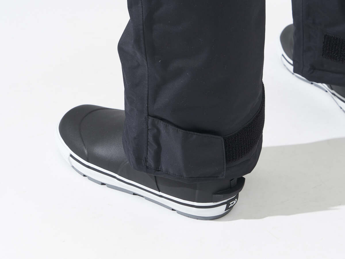 袖口からの浸水を軽減するカフスを内袖に搭載し、衣服内の濡れを最小限に抑える。フローティングベストを着た際にも目立つよう、両肩にリフレクターロゴを配置。袖口回りは汚れが目立ちにくいブラック仕様。ポケットには水の浸入を軽減する止水ファスナーを採用し衣服内の濡れを最小限に抑える。パンツがずり落ちにくいサスペンダー付きモデル。