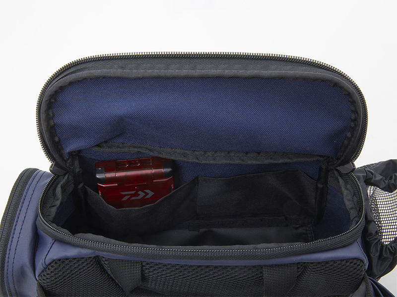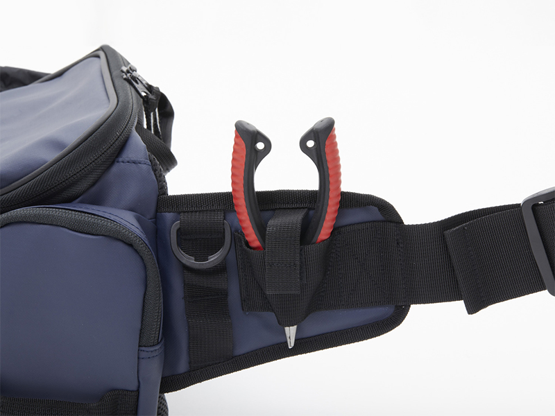 釣行中のルアーチェンジや収納物を取り出す際に、バッグを前に持ってきやすい引手ベルト付き