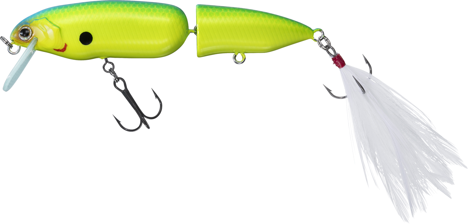 トーナメンターとしても活躍する宮嶋駿介監修の新感覚表層系ルアー。最も特徴的なのがリアボディをポッパー形状にしている点で、移動距離を抑えつつ強い水押しでアピールする。ポップ音やスプラッシュを出すことも可能で多彩なアプローチが可能となっている。ジョイント構造のボディは首振りアクションも得意で連続トゥイッチでは綺麗な180度ターンが可能。リアフックにはフェザーフックを採用し、ただ巻き時により艶めかしく動き、視覚的にもバスにアピールする。フロントフックアイはスイベル仕様。掛かった獲物は逃がさない。
