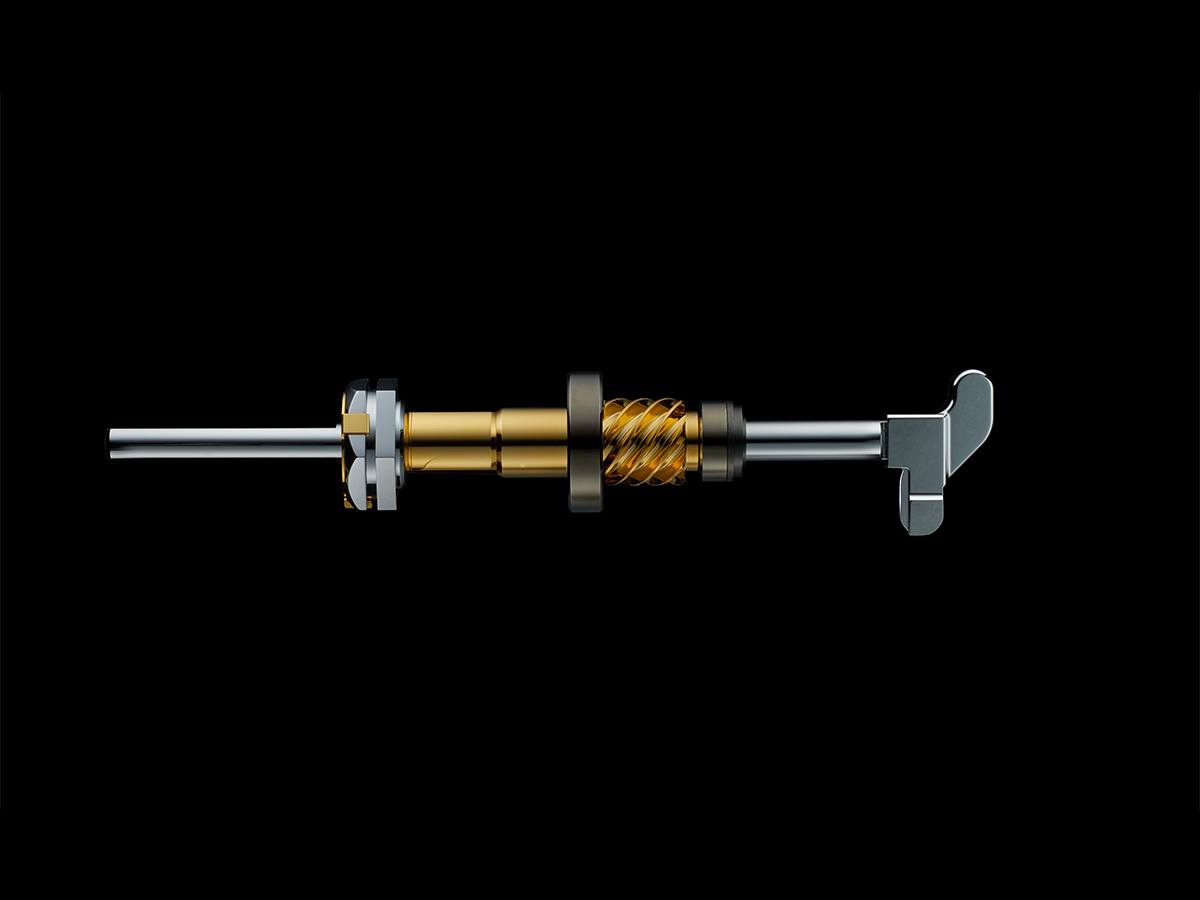メインシャフトとピニオンを非接触構造とし、摩擦抵抗をゼロにするリニアシャフトを、さらにピニオンの両端をBBで支持することで、入力されたパワーを最大限回転力ヘ繋げることを可能としたシステム。さらにメインシャフトを高精度カラーで支持することにより、回転ノイズを徹底的に減らすことを可能としました。
