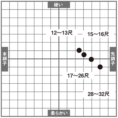 12~16尺 | 特にシビアな時期の沖目狙いの浅棚セットや微妙な誘いが要求される抜きチョウチンや段底など年々軽量中尺アイテムの需要は高まっている。中尺軽量アイテムはその振り調子と先軽さにより、一度手にすると従来の竿に戻れなくなる魅力がある。特に今回15尺は4継化されたことで、より攻撃的な攻めが可能なシャープな振り心地を得ている。 |