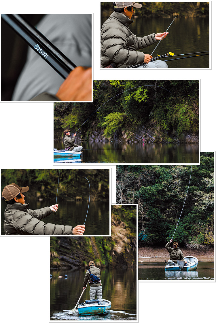 2020年1月某日、HERA R最終段階の機能確認のため降り立ったのは寒風吹きすさぶ三島湖。テストを担当した生井澤は「技術が進化してパソコン上でいろいろなシミュレーションが可能になっても、最後はフィールドが竿の良し悪しを判断してくれるんです。」と、言う。様々なシチュエーションが予想されるへら竿の場合、実釣での同条件比較がしやすい暖かい時期に調子やパワーなどの方向性の絞り込みを行いはじめ、徐々にフィールドがシビアな状況になるにしたがって、各パーツの使い心地や細かな調子の調整をする。そして、やっと1本の竿に仕立てられる。最初に用意されるブランクスは1節について数タイプX継数。その組み合わせだけでも膨大な数にのぼる。それを実際にへら鮒を掛けながら組み合わせを変えて生地組みを行い、それをベースにさらに細部の調整を行っていく。HERA Rには新たな試みが複数取り入れられているため、通常よりもはるかに多いチェック項目が課せられていた。テストの最後に「へら竿の機能としては今出来る最高峰の仕上がりになりました。ここまででやっと半分段階。後はこの竿を使ってくれた皆さんがへら鮒釣り楽しんでくれる姿を見られてようやく完成ですね。」と、初めて満足気な笑顔を我々に見せてくれた。