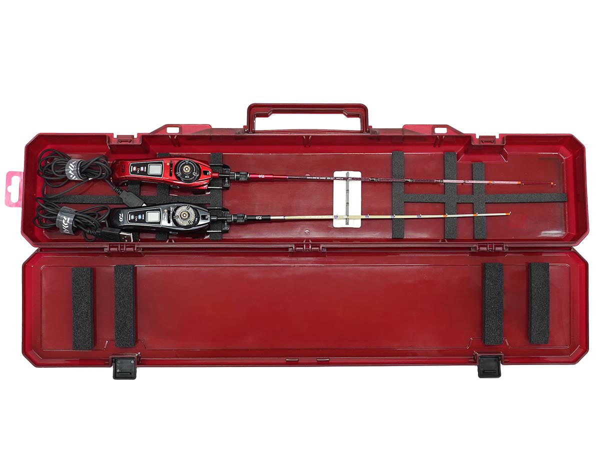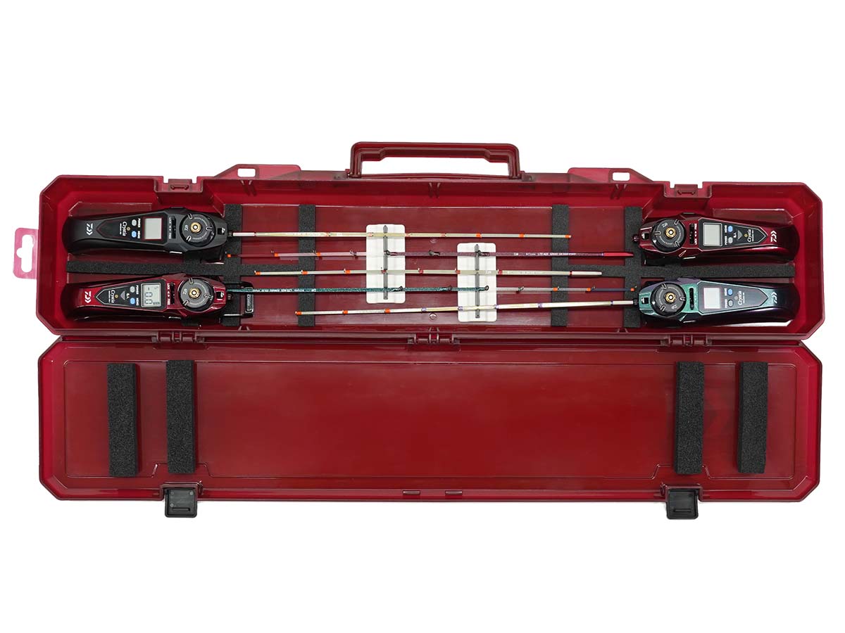 ワカサギ電動リールを最大4台収納可能。外部電源用コードもすっきり収納できるワカサギタックルケース。