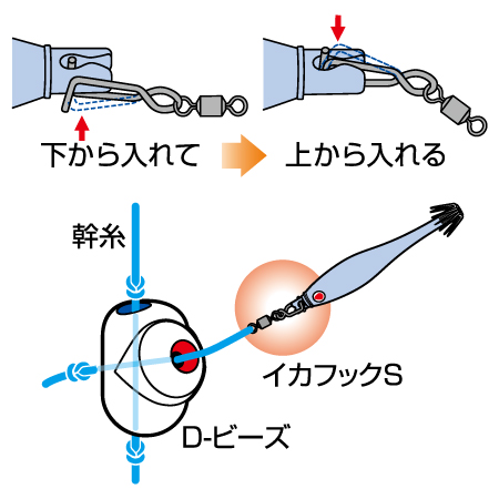 イカヅノの動きを自然に保つ小型軽量フック。着脱が簡単で糸絡みしにくい挟み込みタイプ。