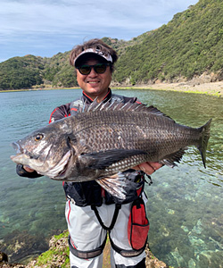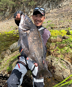 銀狼唯牙シリーズは、過去の流行りだった張りが強い使用感の銀狼シリーズから180度変更したこだわりのシリーズです。開発テストではアイテムごとにフィールドを変えて、それぞれの号数に求められる理想の強さ、粘りを実現しました。僕がメインに使う06号~1号は、良型が数狙える時や、根の荒い場所でチヌを怒らせない粘りと寄せてくるパワーが魅力です。また、今回のBIGONEは御荘湾や宿毛の超大型チヌを獲る為に創り上げました。サンゴや牡蠣殻が点在するフィールドでのパワー勝負になる為、バットパワーを上げているのですが、全体的にしっかりタメが効き、隙が無いバランスになっているので、チヌの最初の突進もラインを極力出さずに止めることができ、50cm後半のサイズも余裕で浮かせることが出来ました。