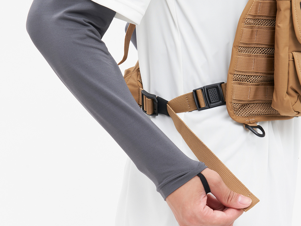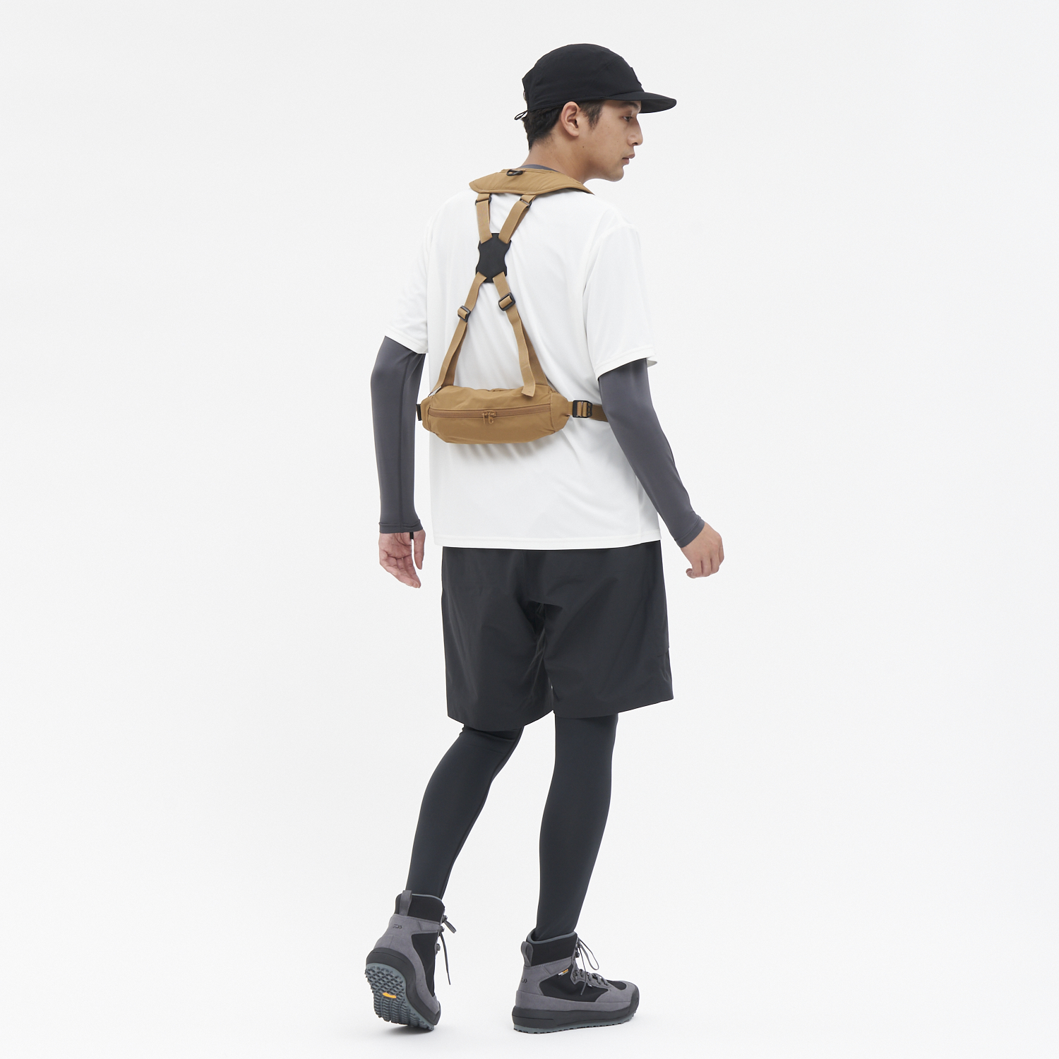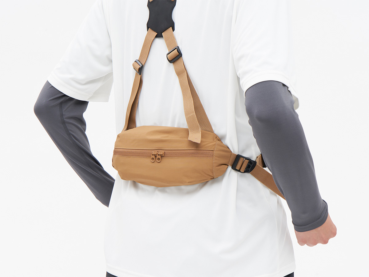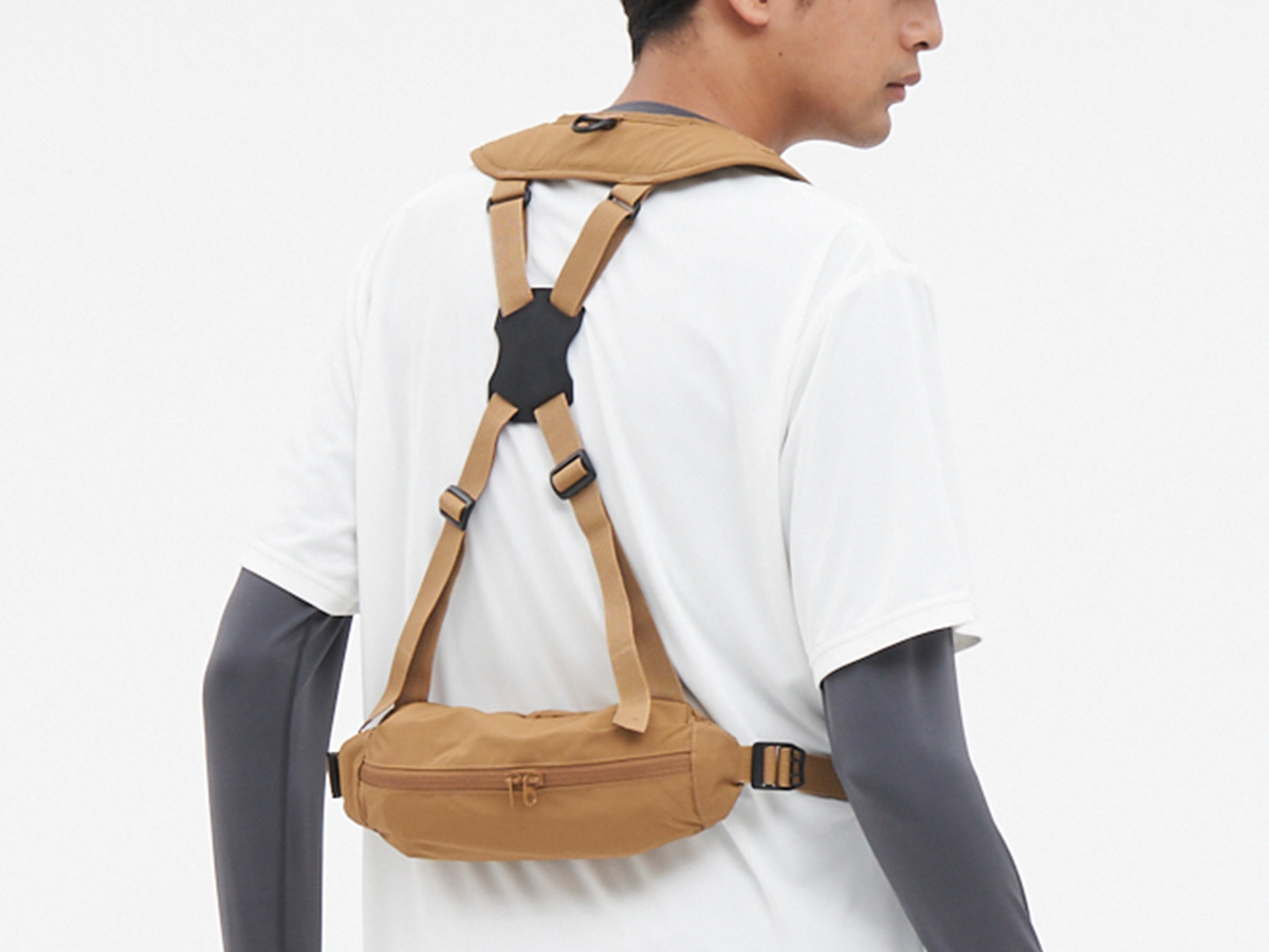 腰サポートの中に収納されているバックパックを肩テープに取り付けることができる。