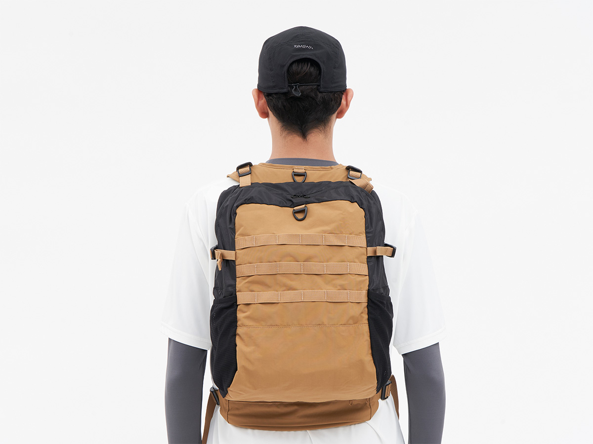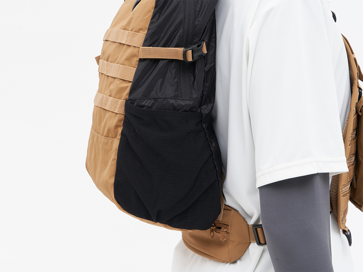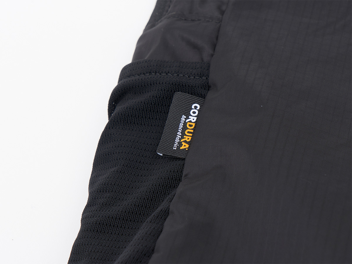 収納状態のかさばりを軽減するためバックパックの横生地には軽量で高い強靭性を持つCORDURA生地を採用。