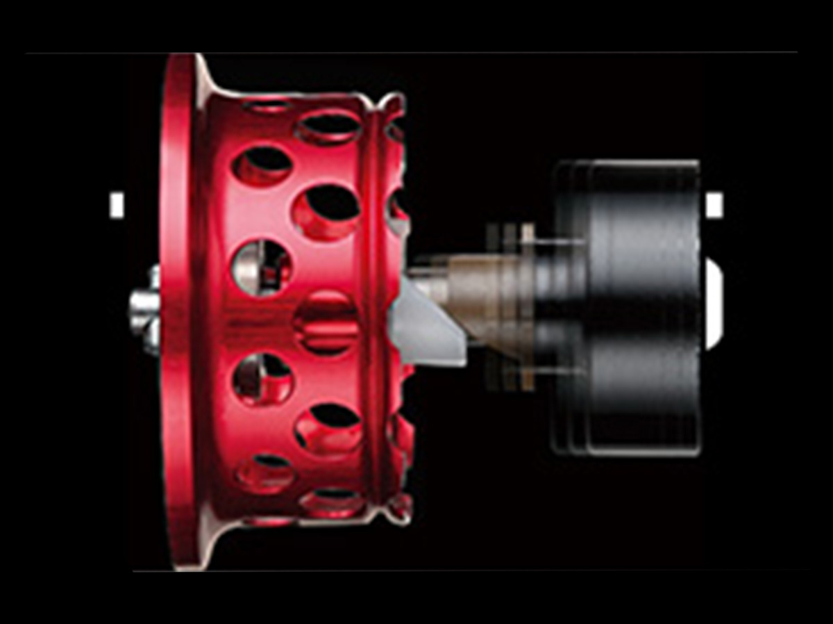 アキュラシー性能を大幅にアップさせつつ、極めてバックラッシュが少ない、ストレスフリーな使い心地を実現したブレーキシステム。軽量インダクトローター構造と軽量スプールとの組み合わせでスプールユニットとしての回転レスポンスを大幅に向上。同時にオン&オフがハッキリした効きの良いマグブレーキとの相乗効果を狙ったセッティングでフルキャスト時にはしっかりブレーキが効くが、ピッチング等の低回転時にはインダクトローターが飛び出さず低弾道で撃ち込める。つまり、小さい力でもスプールがスパッと立ち上がり、力まなくても驚くほどルアーがよく飛び、逆に力みにより発生するバックラッシュゾーンに対してはきっちりブレーキを掛ける。結果、同ブレーキ設定で、ピッチングとキャスティングが高レベルで両立する快適さをもたらした。