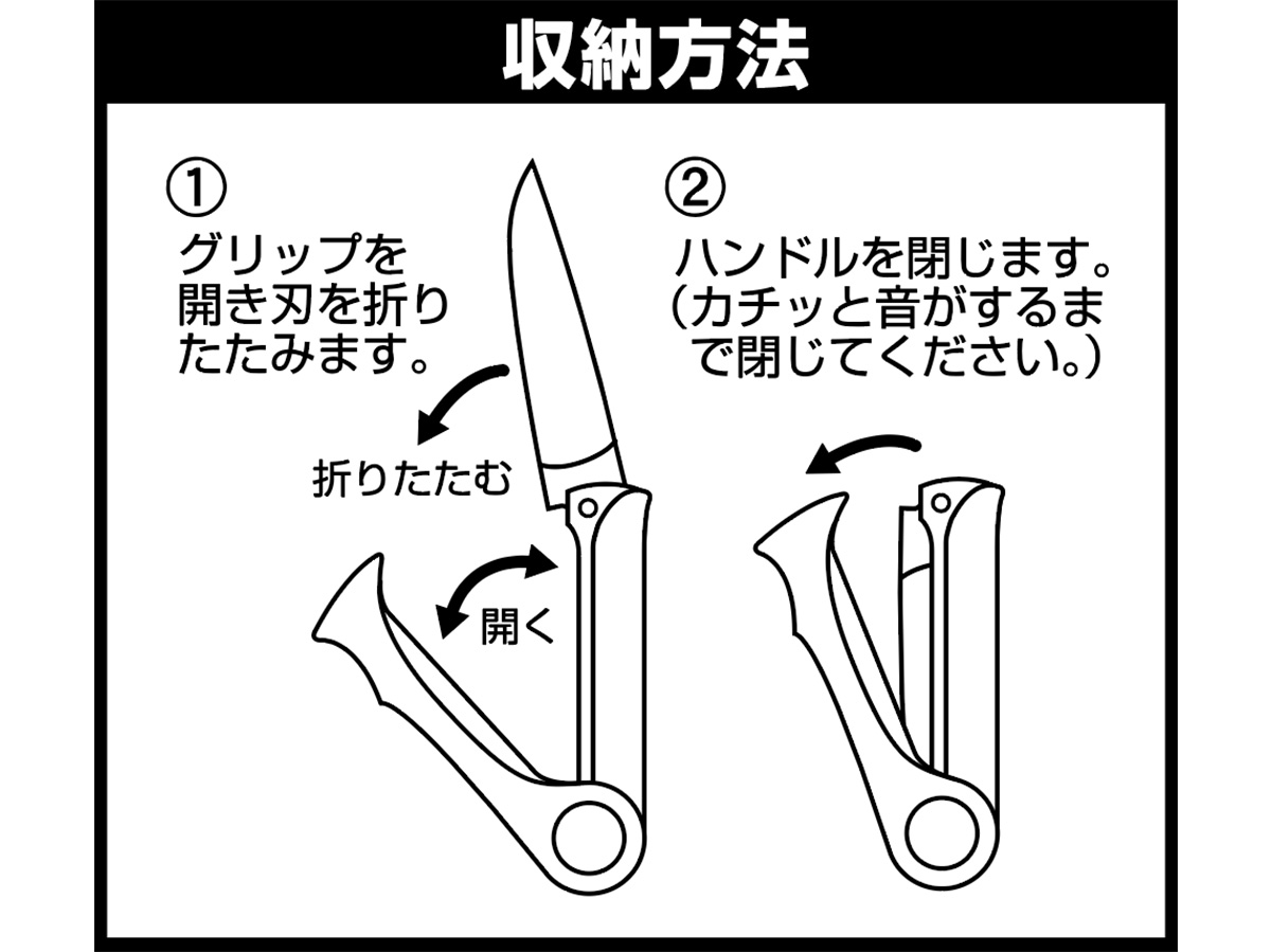 ステンレス製で錆びに強く、また錆びによる固着に強い新規折り畳み構造となっている。