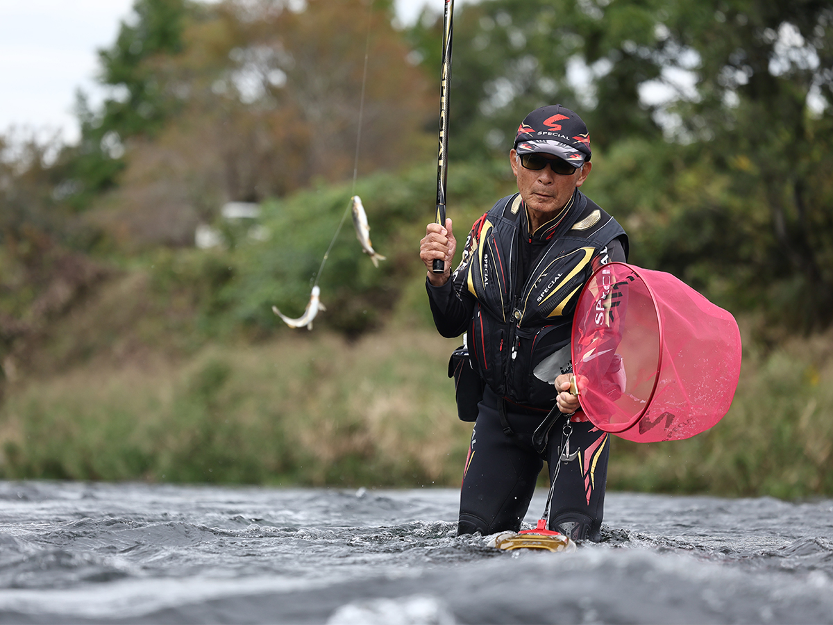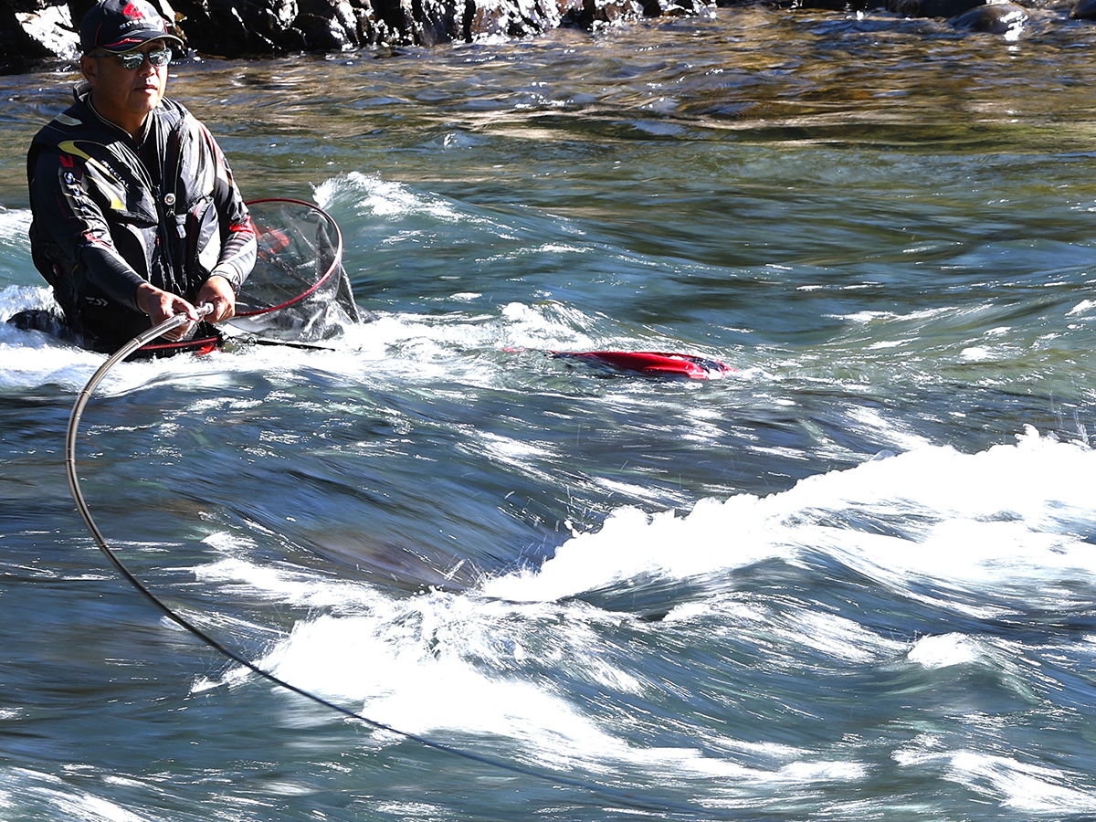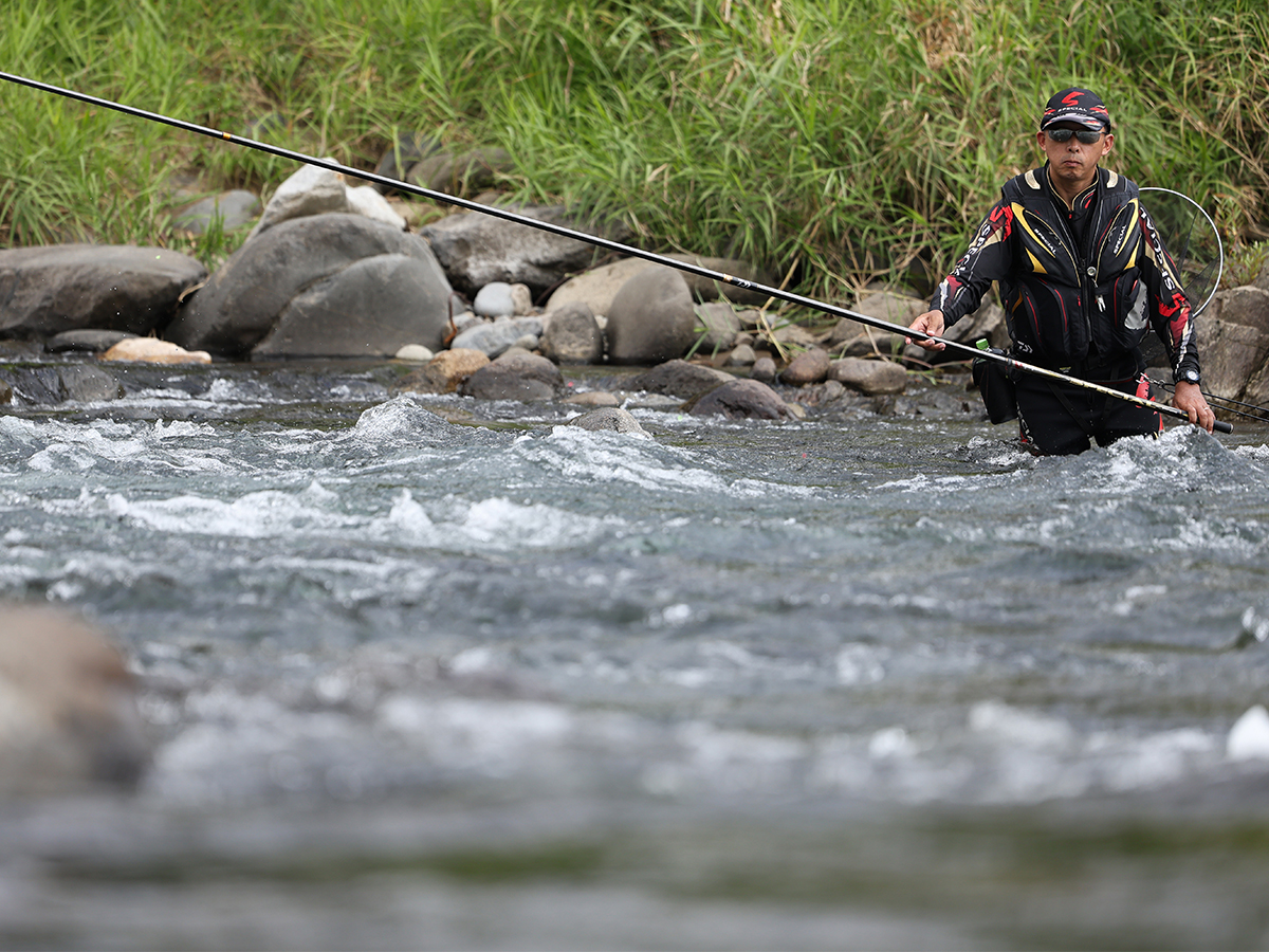 比較的、石の大きな河川を得意としながら、45度前後の縦竿での繊細なテンションコントロールで引き、泳がせを微調整できる操作性も兼ね備える。