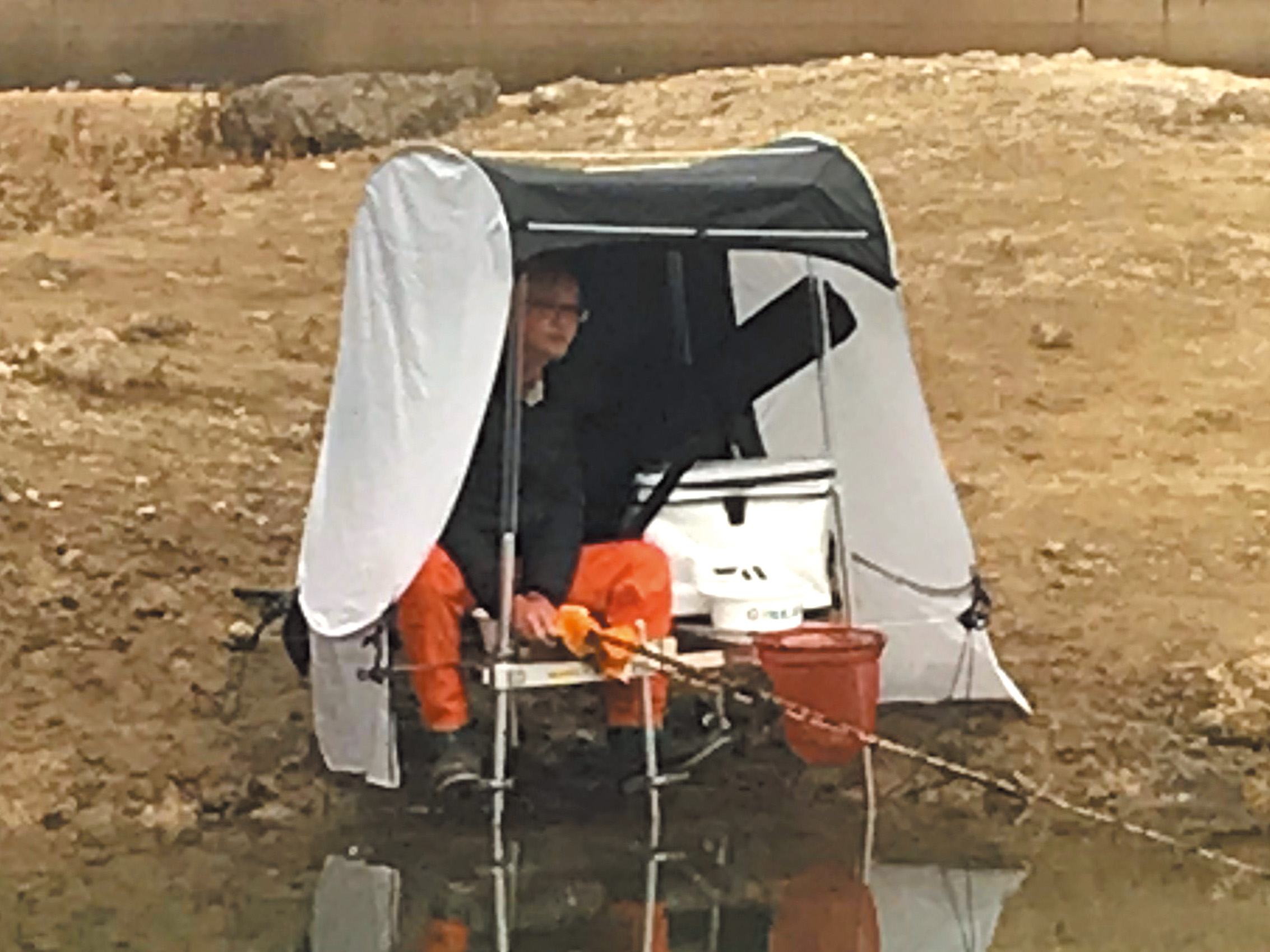 このテントは、へら台の足に付属のパイプを差し込み、テント本体を被せてセットすれば、横からの雨の差し込みを防ぐので、快適な釣りが可能になる。