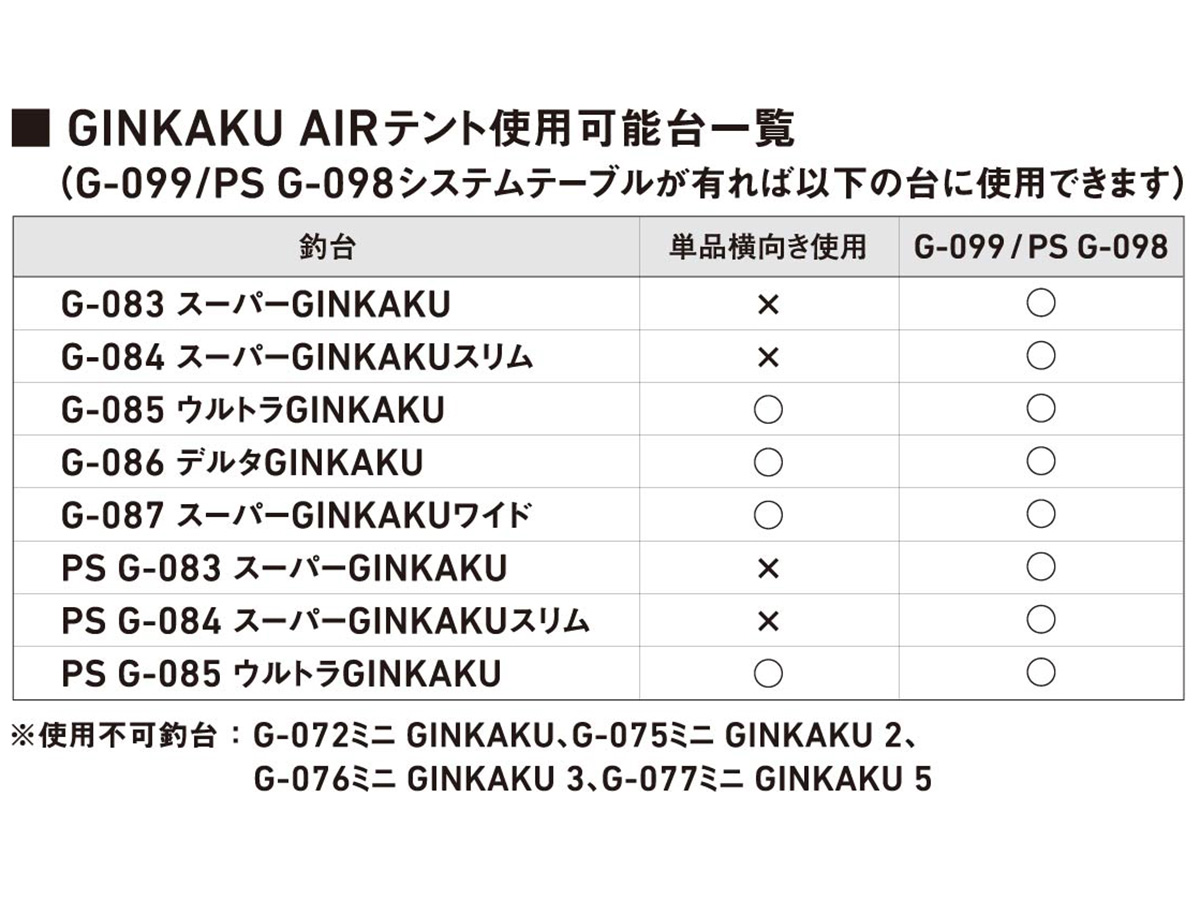 GINKAKUAIRテント使用可能台一覧