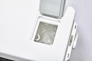 エサや小物が入れられるトレー付き。投入口下の位置にビニール袋を取り付け可能。