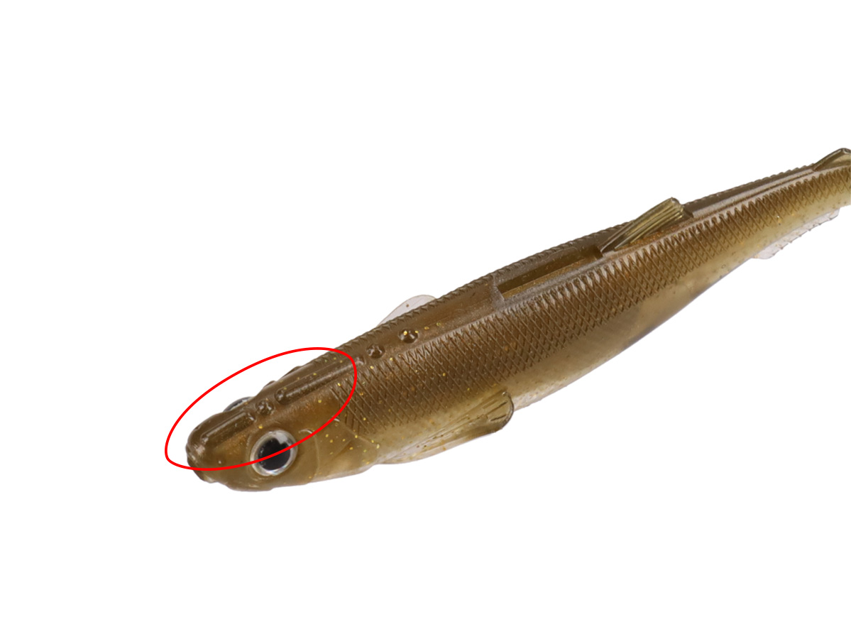 ジグヘッドの刺しやすさを追求したアシストマーカー。ボディ面一で刺しやすいように線状の肉盛とジグヘッドのフックポイントを抜く位置が分かりやすい丸状の肉盛を配置。ボディ面一で刺すことでロールしやすく、水平姿勢になりやすい。