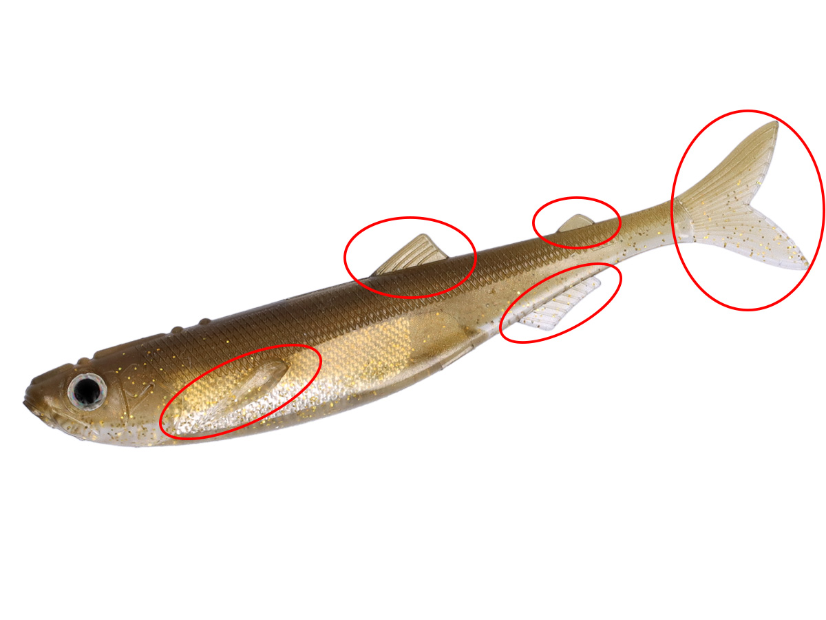 ロールアクション時に水を攪拌させることを狙ったフィン。リアルな見た目でありながらロールしにくくなるギリギリのサイズ感で搭載し、水を掻き回してアピールする。