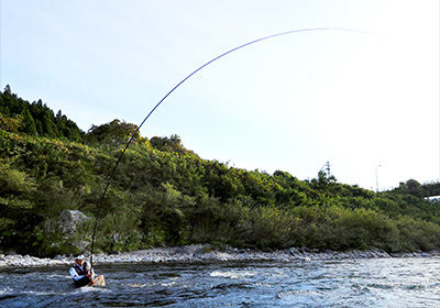 A調子は、やはりとても軽いですね。そして胴に乗るので引きやすい。グリグリ引く釣りやワイドクロス釣法では、きれいに胴に入ってくれる竿じゃないとオトリがついてこないし、できません。いろんなポイントがある長良川ではTかAHかで悩みますが、最近はAHを手にすることが多いですね。ソリッド穂先を利かせて管理しながら、立て竿でピンポイントも攻略できますし、特にスペシャルAは大会でも活躍すると思います。