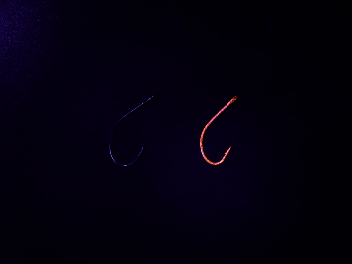 ■ノーマル針とケイムラピンク針のUVライト照射時比較
