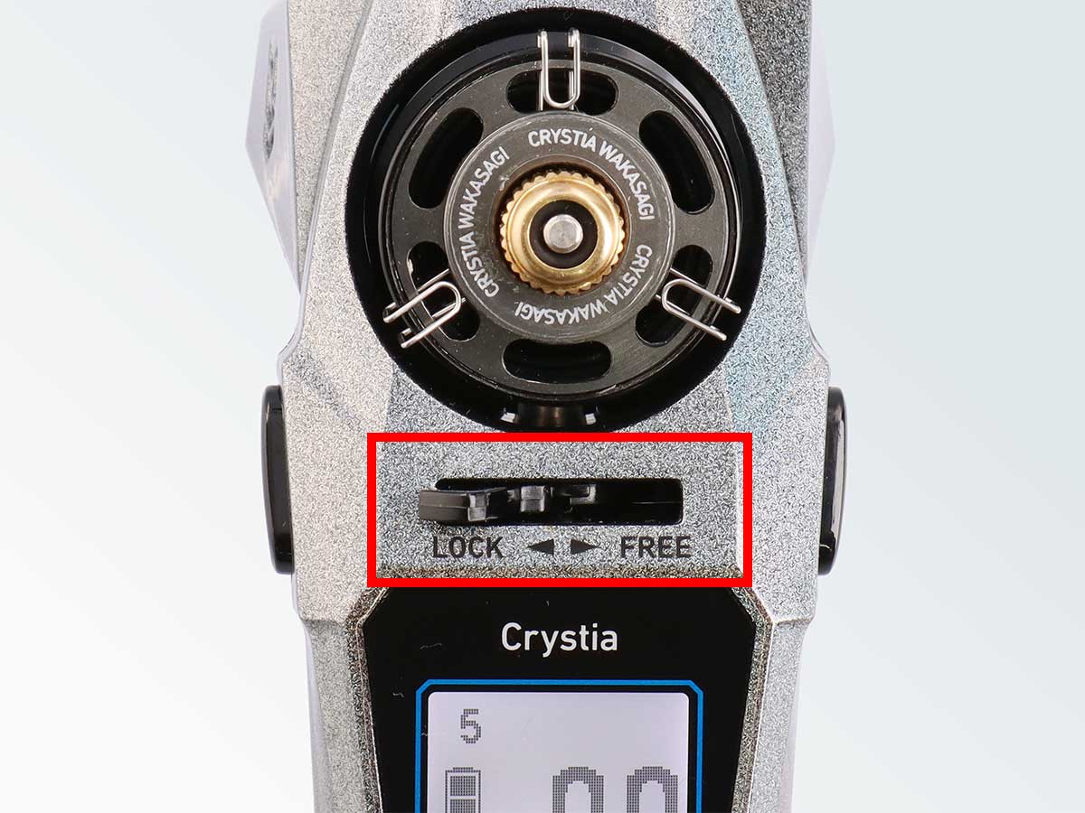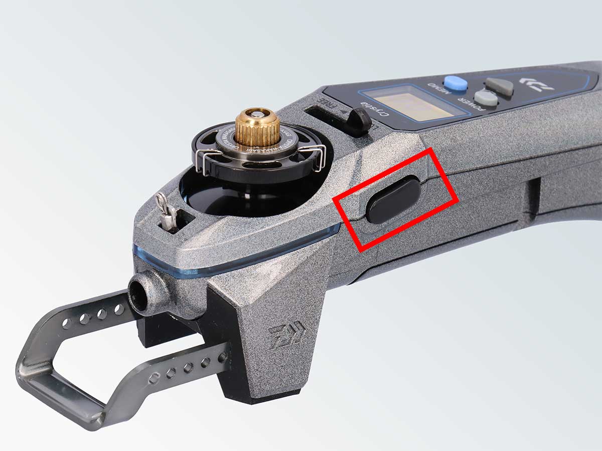レバーを右側に倒すとクラッチ「フリー」=スプールがフリーになって糸が出る状態になる。レバーを左側に倒すとクラッチ「ロック」=スプールがロックされ、巻き上げができる(ボディ側面の巻上スイッチを押すことでもスプールはロックできる)。