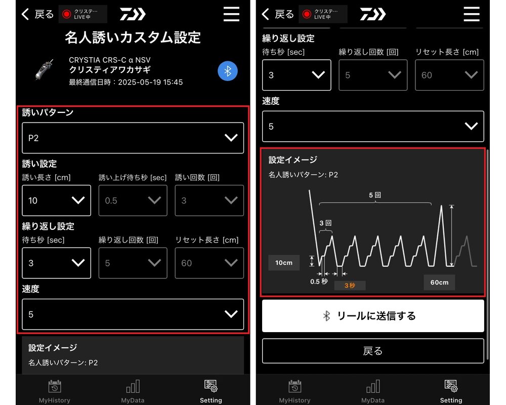 名人誘いパターンの選択、誘い長さと待ち秒を選択し送信すると、変更した誘いパターンをリール本体に設定完了。また、アプリを使用時のみPc(パターンカスタム)の設定が可能、誘い長さと待ち秒だけではなく、もっと細かい条件の設定でマイ誘いパターンの設定ができる。